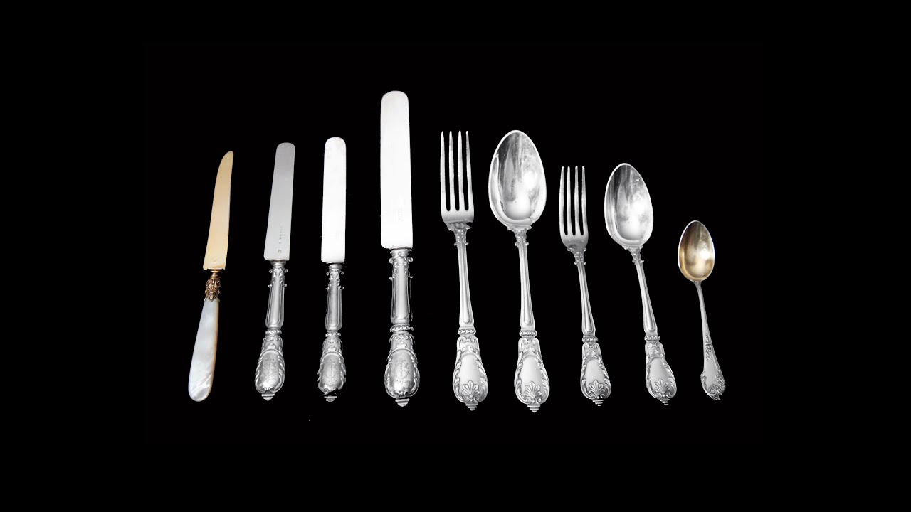 The House of Odiot was founded in 1690 and for over three centuries the company of silversmiths has maintained it’s fabulous tradition of creating masterpieces in sterling silver and gold plated sterling silver (vermeil). For five generations the firm has been silversmiths to the Kings and Queens of Europe as well as Presidents and Emperors around the world. Today the firm still maintains it’s ranking as one of the best silversmiths in the world. This amazing 126pc. flatware set in 950 sterling silver is a stunning example of the outstanding craftsmanship of the firm. The luxurious dessert knives with Mother-of-Pearl handles is by a different manufacturer and bears the French Government’s Head of the Minerva 2 hallmark. The dainty coffee / teaspoons are also by a different manufacturer in a complimentary pattern but bear the French Government’s Head of the Minerva 1 hallmark. The remaining flatware pieces all bear the French Government’s Head of the Minerva 1 hallmark in addition to the House of Odiot manufacturer’s sterling silver hallmark. The set includes the following (all weights and measures approximate):