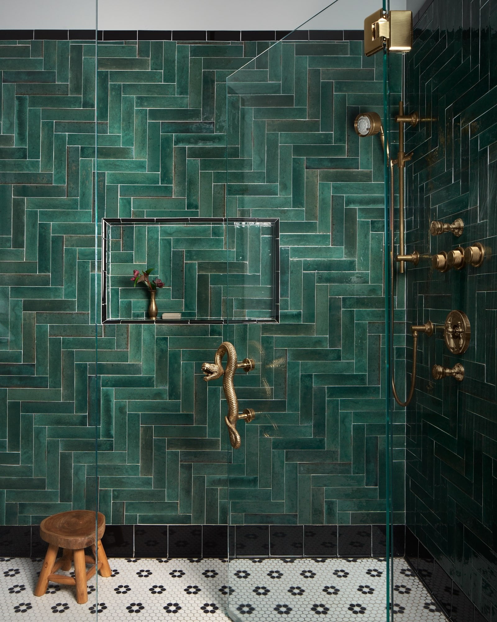 Herringbone patterned tile shower with a serpent-shaped door handle in a renovated 18th-century farmhouse, Lumberton, Burlington County, New Jersey [1600×2000]
