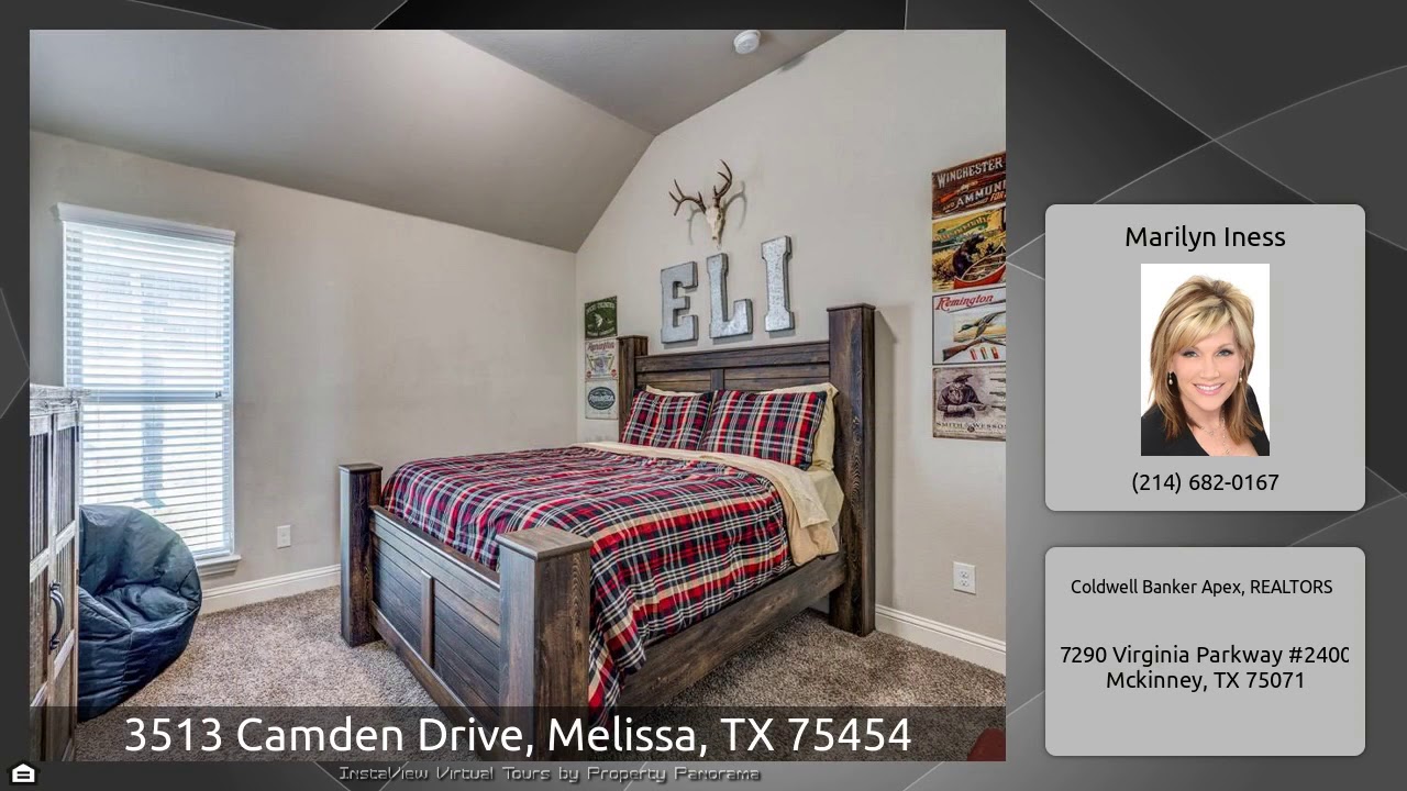 The Virtual Tour for the property at 3513 Camden Drive, Melissa, TX 75454 listed for $2,195: Other homes for sale by Marilyn Iness of Coldwell Banker Apex, REALTORS: WELCOME HOME! This beautiful, open floor plan is barely lived. Melissa ISD, 1 story, 3 bedroom, study with french doors, formal dining and tons of gorgeous upgrades. White kitchen cabinets, stainless appliances, wood floors through out the study, formal dining, living and kitchen area. Includes refrigerator, washer and dryer. Craftsman fireplace in living area, large island in kitchen, beautiful granite counter tops, awesome …
