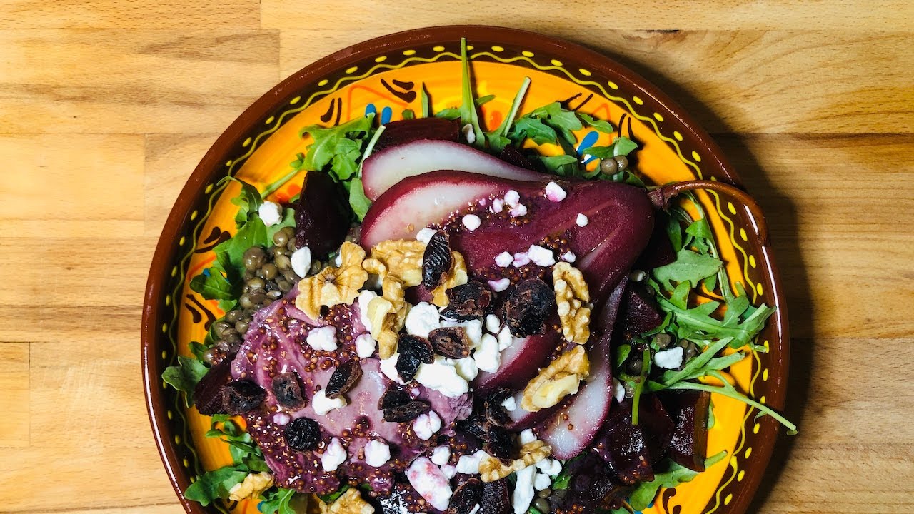 If you like purple, you will enjoy my 3 Purple Salads. I use red wine with rosemary to poach the pear and the egg. I also add beets to the salads to give an earthy taste to balance the sweetness of the fruits. Egg yolk and goat cheese provide a creamy texture. It also has French lentils and walnuts to give you some fiber and extra nutrion.
