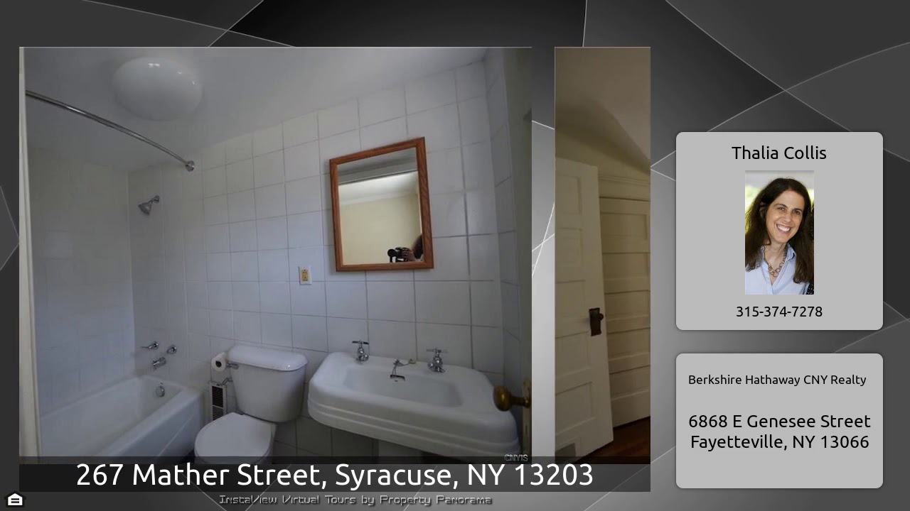 The Virtual Tour for the property at 267 Mather Street, Syracuse, NY 13203 listed for $159,000: Other homes for sale by Thalia Collis of Berkshire Hathaway CNY Realty: Totally Renovated Four Bedroom Colonial With Master Bedroom Suite On The First Floor Kitchen With Cherry Cabinets And Additional Prep Kitchen,Natural Sunlit Solarium,Hearth Warmed Family Room, Unique Architectual Dining Rm With Window Seat Bay Windows And Original French Doors. Exterior Rear Stone Terrace Patio With A Western Direction Provides Privacy And Light. A Must See Property