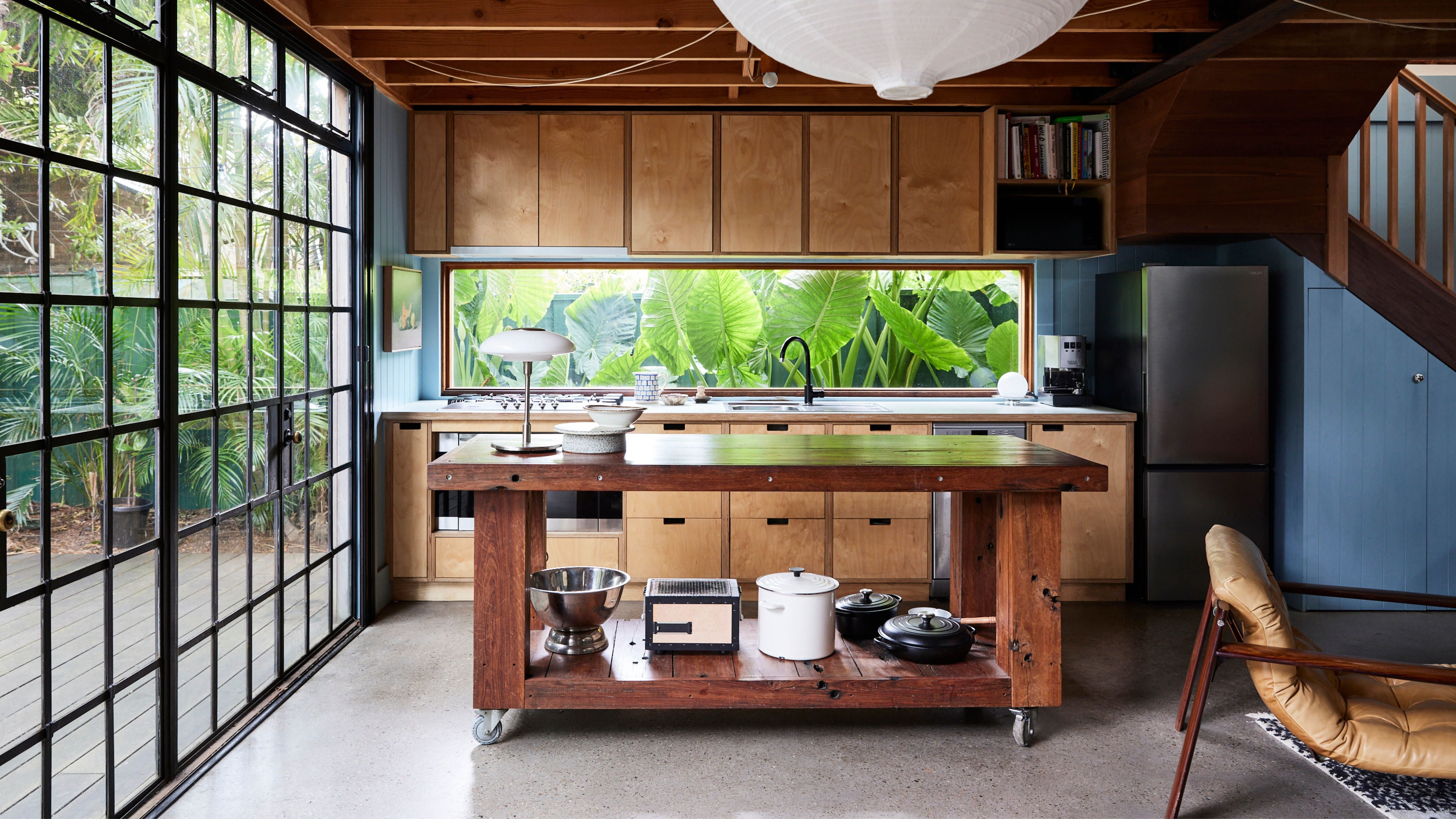 Kitchen and dining space with black framed windows with views of tropical foliage in an eclectic home, St Peters, Inner West of Sydney, Australia [6250×3515]