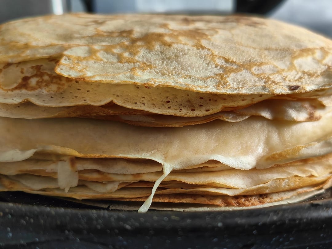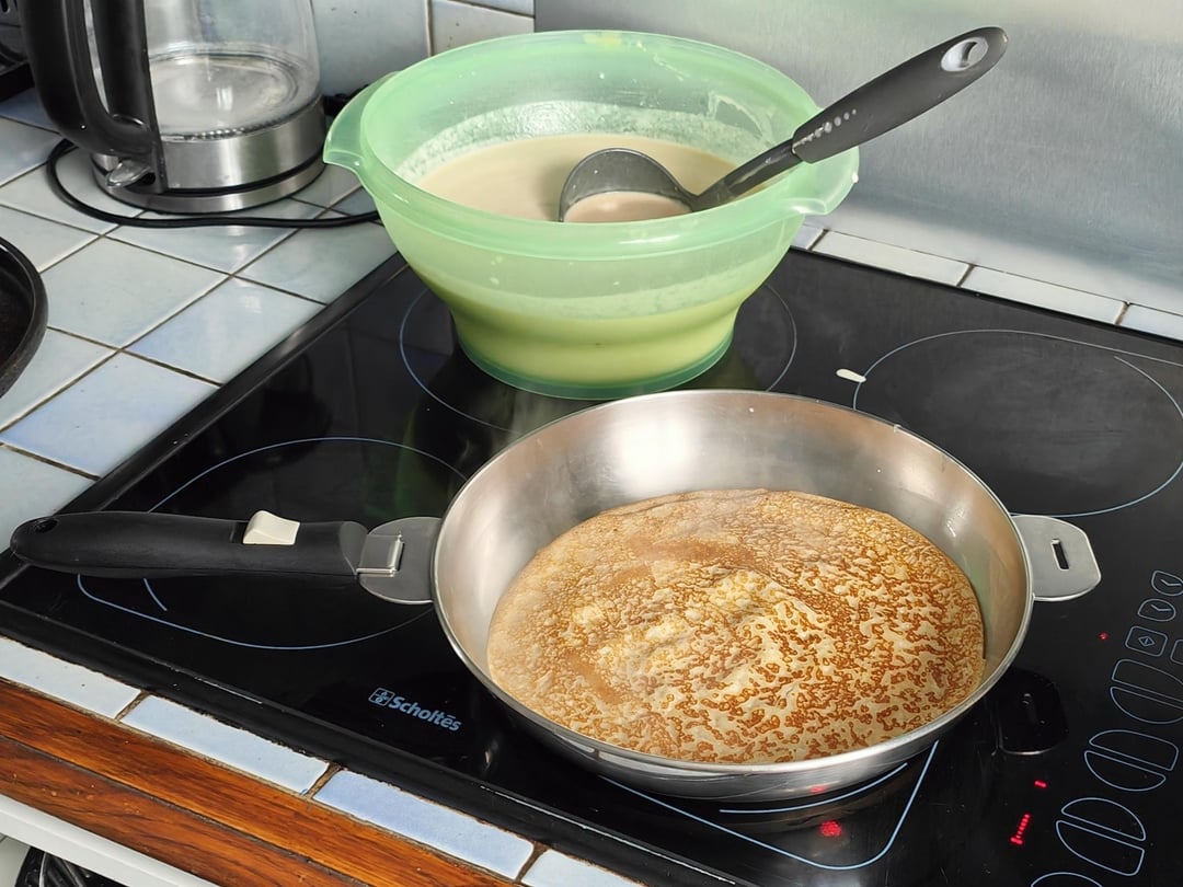 Je trouve très appréciable d’être tiré du lit par une douce odeur de nourriture… Pain grillé, café, chocolat chaud et aujourd’hui des crêpes.