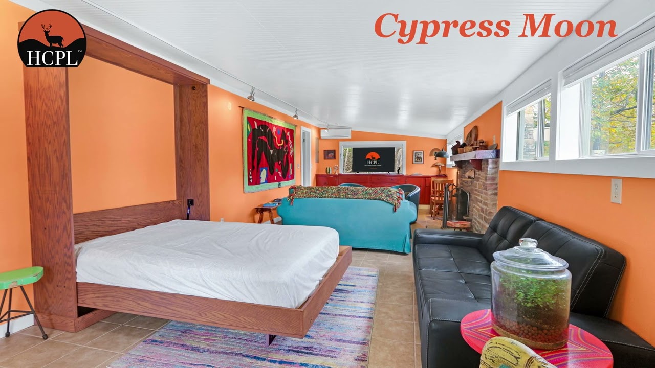 As you step through the door of Cypress Moon, the eclectic atmosphere immediately captures your senses. The vibrant colors and unique textures throughout the cottage create a visually stunning and inviting space. The living area beckons with a wood-burning fireplace, perfect for snuggling up during cool evenings, and a versatile Murphy bed provides an additional sleeping space for two. Elegance and warmth resonate through the charming decor, setting the stage for a memorable stay.