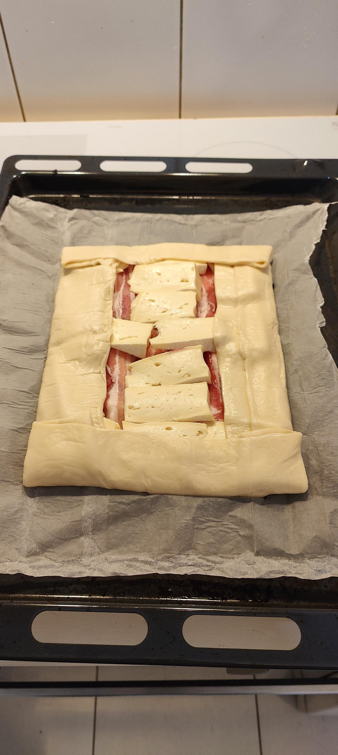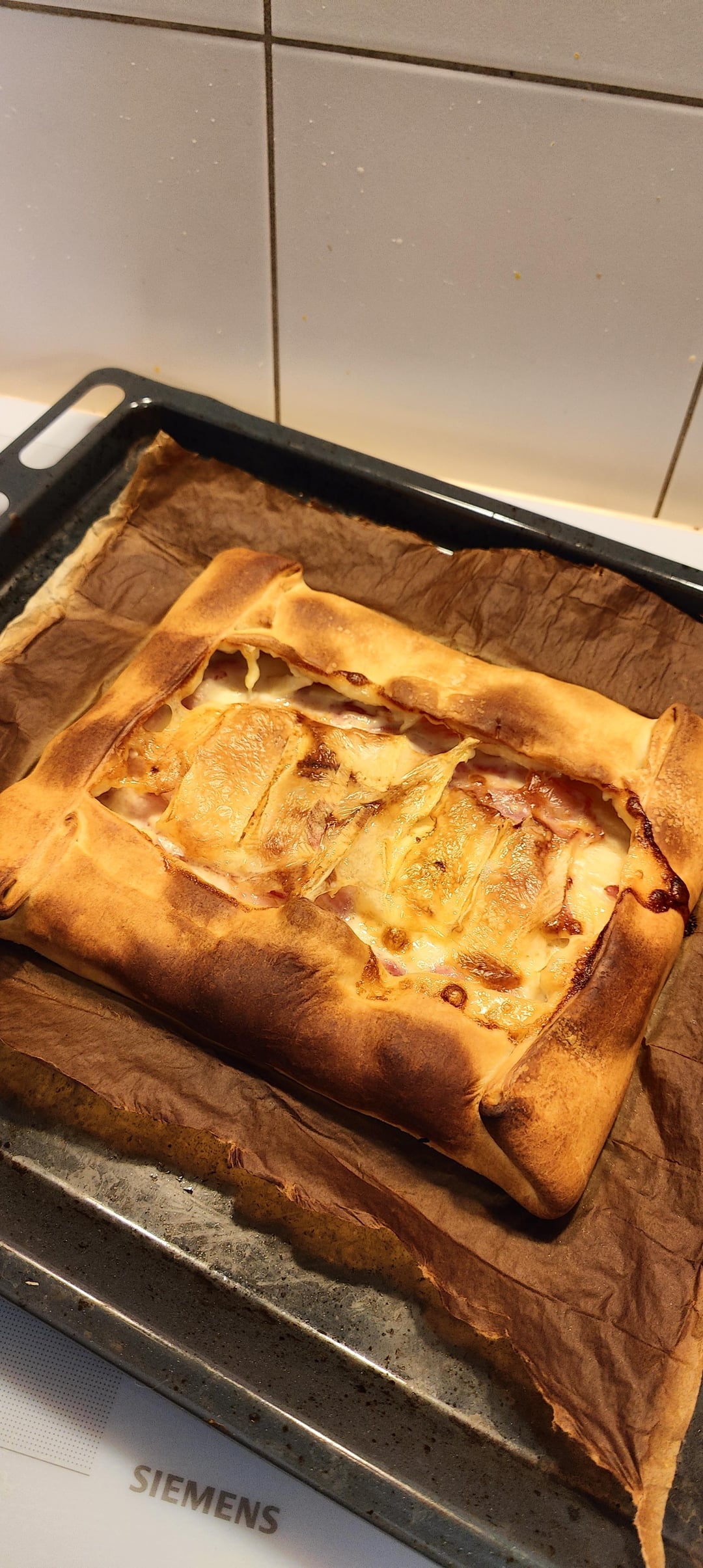 Vous repliez les bord dessus pour que le roblochon fondu reste sur la pâte, 20-25 minutes à 200°C et c’est une dinguerie.