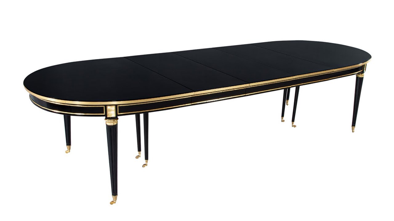 This magnificent Maison Jansen Dining Table, restored to its former glory, is sure to be the centrepiece of any dining room. The exquisite French 1940’s style is evident in its Louis XVI influence, and the high gloss polished black lacquer finish adds a touch of sophistication. Its original brass ornaments further bring out its old-world charm. This table also comes with three extension leaves, and two sets of drop down legs for added support. This exquisite piece of furniture is sure to be the conversation piece of every dinner party you host. Make your dining room the envy of all with this attractive piece of furniture, perfect for any discerning collector.