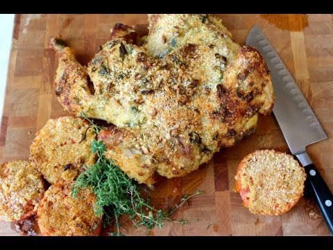Done all right so they the chicken’s all done the tomatoes are all nice and kind of brown on the top so we’re going to go ahead and take this out see how it looks oh my God it’s heavy look at that beautiful a nice French roasted chicken I hope you like it