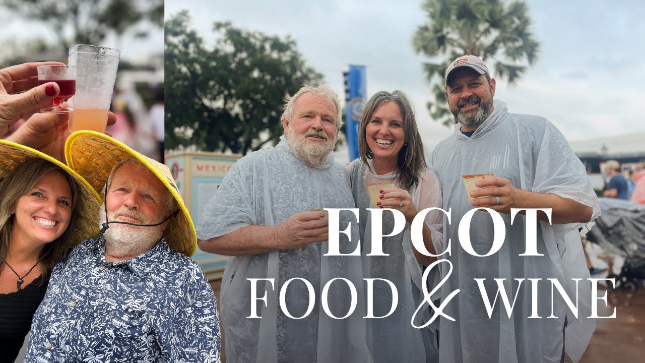Us Mom are you happy you have your Walker yes it’s going to be so Great welcome to Epcot friends the Food and Wine Festival 2023 so our hope for pretty weather isn’t happening as soon as we get here I’ve never done a feed park with a poncho on but we’re doing that today first time for everything let’s see if Scott can figure it