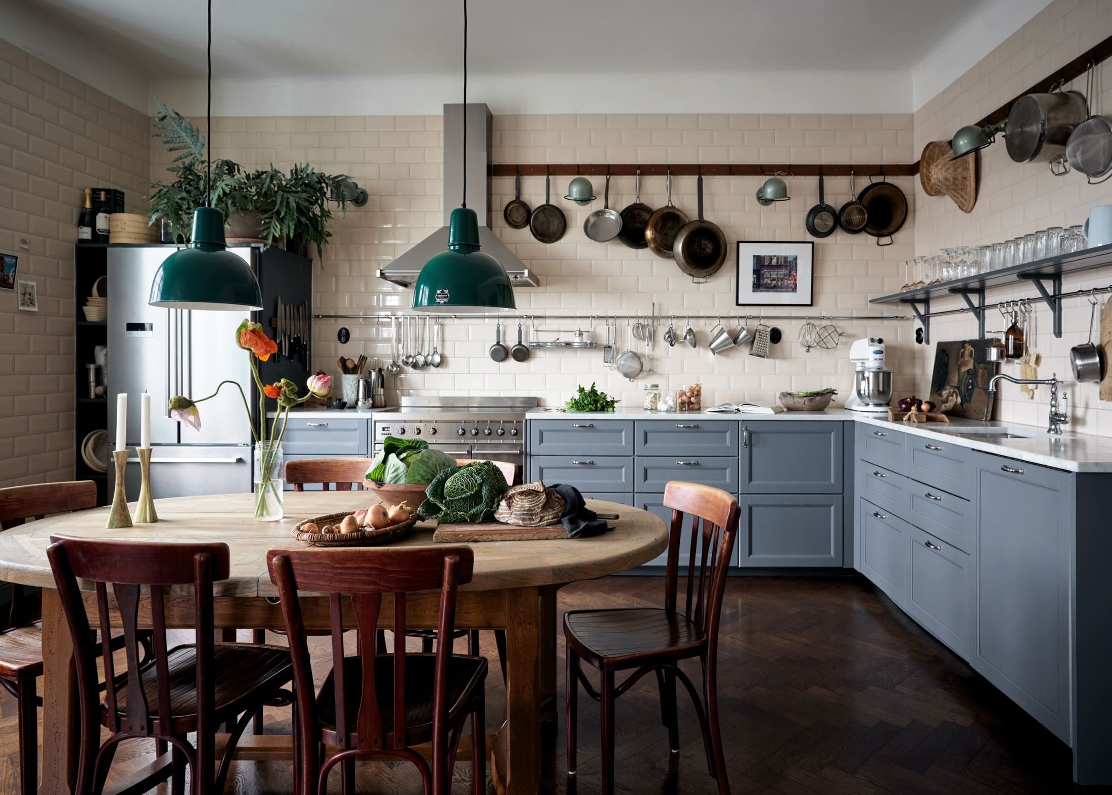 Spacious kitchen with herringbone floors in a renovated 1900s three-bedroom apartment, Liljeholmen, suburban Stockholm, Sweden [2200×1572]