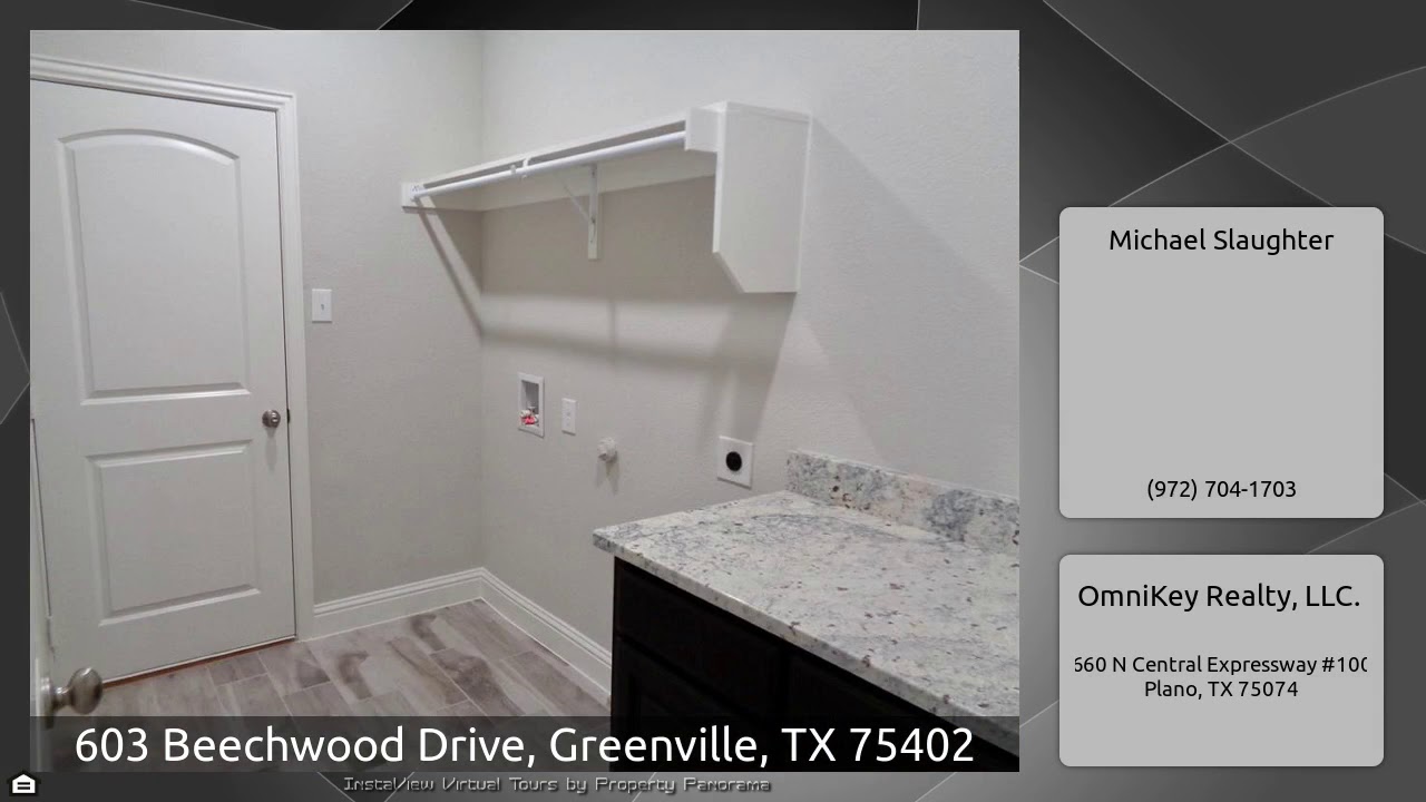 The Virtual Tour for the property at 603 Beechwood Drive, Greenville, TX 75402 listed for $1,625: Other homes for sale by Michael Slaughter of OmniKey Realty, LLC.: *1 WEEK FREE RENT WITH IMMEDIATE MOVE IN!*DEPOSIT-FREE!* Gorgeous brand new build in Greenville! This amazing home features high ceilings with crown molding, french doors opening into office space, open concept kitchen and dining area with great natural light! Kitchen features island, stainless steel appliances, pantry, and a breakfast area! Spacious bedrooms with great closet space! Master bathroom features two vanities, stand- …