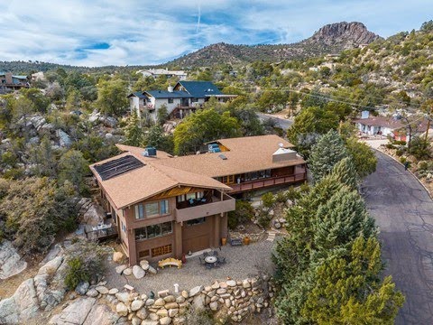 Gorgeous mountain modern home with panoramic views of city lights and mountains! Just 2 miles from the downtown Prescott square, this, remodeled, custom home offers 5,053 sq. ft. with a main house of 3,362 sq. ft and a guest house of 1,691 sq. ft. with a private entrance. Perfect for an Airbnb or rental, the guest house is equipped with a kitchen, bathroom, dining room, living room, and bedroom with access to a private patio. The main house offers 3 bedrooms, 3 baths with an open floor plan plus a formal living space and den. Gorgeous bamboo floors throughout. Enjoy the cozy stone fireplace with built-in seating that looks out to panoramic views of the city lights, mountains and trees. Entertain in the gourmet kitchen with a custom table island, stainless steel appliances, double pantry and french doors that spill out to a private patio with a pool house. The pool house is heated with a shower area. 3 car garage has an RV bay, epoxy floors and a huge storage loft. Spacious lot with room for RV parking. 3 patio decks included a covered wrap around upper deck. Level, usable yard for outdoor entertainment. 2 large double door storage areas. Handicap doorways and a ramp for easy access to the main house. New HVAC units. New bathroom cabinets and flooring. Single level living. Low maintenance. No HOA.