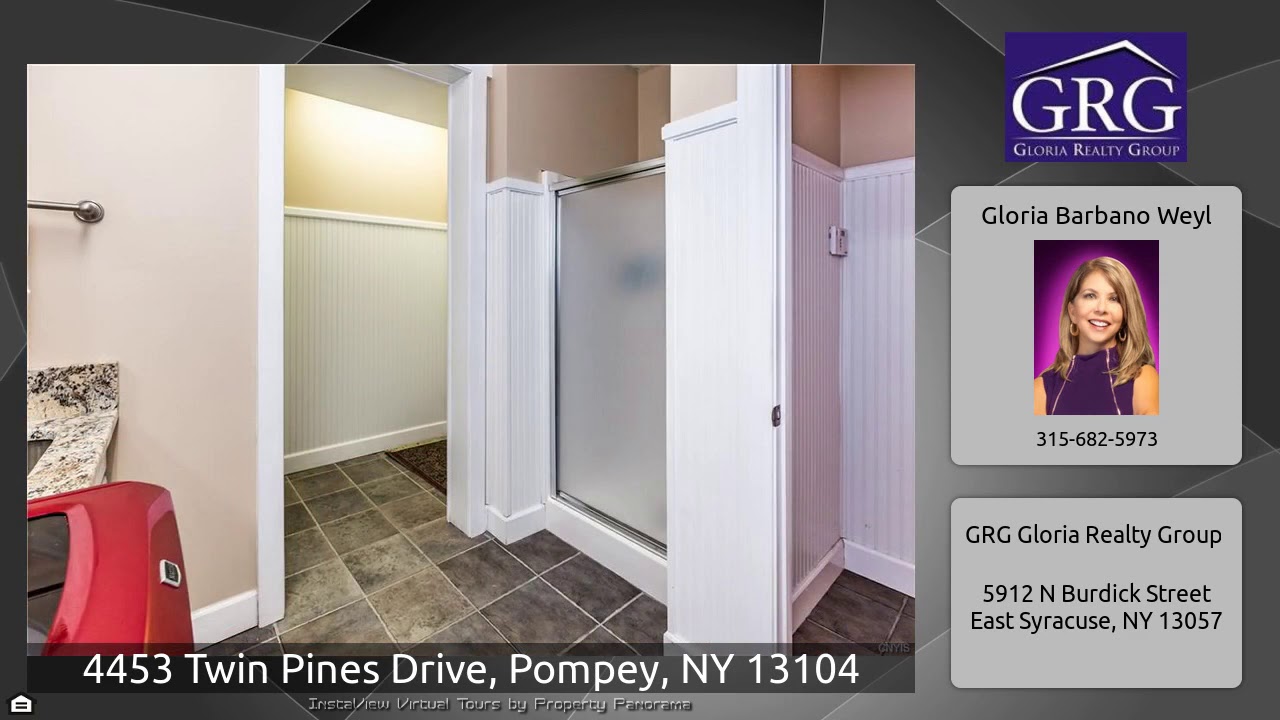 The Virtual Tour for the property at 4453 Twin Pines Drive, Pompey, NY 13104 listed for $464,900: Other homes for sale by Gloria Barbano Weyl of GRG Gloria Realty Group: Fantastic home w/tens of thousands of dollars in updates and extras! Custom built home in Spruce Ridge neighborhood. Enter into the two story grand foyer with French doors to home office or fifth bedroom. Everything about this home lends itself to entertaining family and friends from the extra large formal dining room to the chef's gourmet kitchen w/2 story breakfast area w/French doors to large deck & patio. Family room …