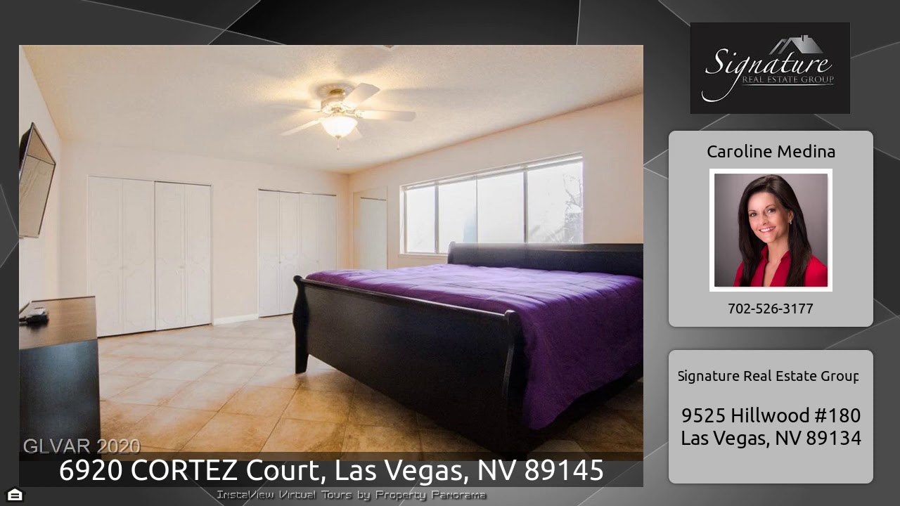 The Virtual Tour for the property at 6920 CORTEZ Court, Las Vegas, NV 89145 listed for $275,000: Other homes for sale by Caroline Medina of Signature Real Estate Group: Well kept one story in a private cul-de-sac, lush large backyard with many fruit trees and custom covered patio, French double front doors, Ceiling fans throughout, 2-way fireplace shared with living room & dining room with stone facing up to ceiling, Large master bedroom, NO HOA, 2 car garage has been converted to a 1 car and a temp workshop which can be removed and turned back into 2 car easily, conveniently located to …