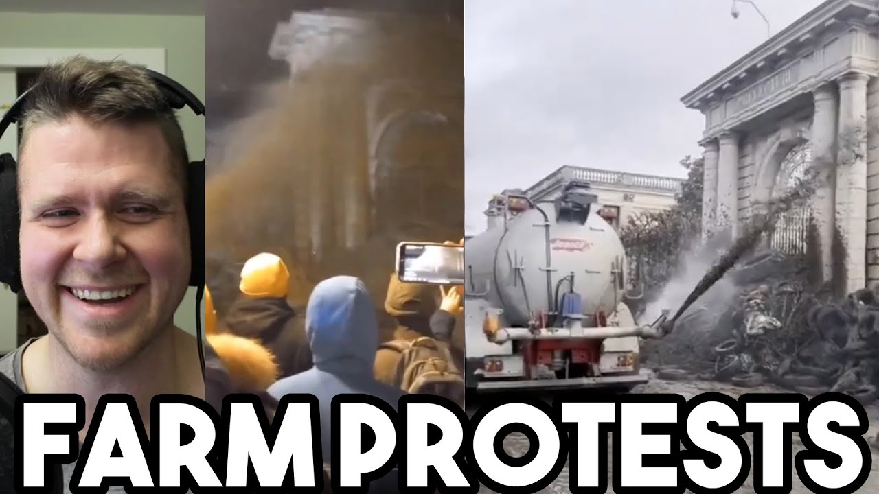 Protesters and and the farmers and stuff it’s you know there’s one clip I saw the farmers were helping tow a police car that was stuck out in the field and and finally we’ve got a clip here of the farmers with a full-on Hershey squirts all over this government building gross