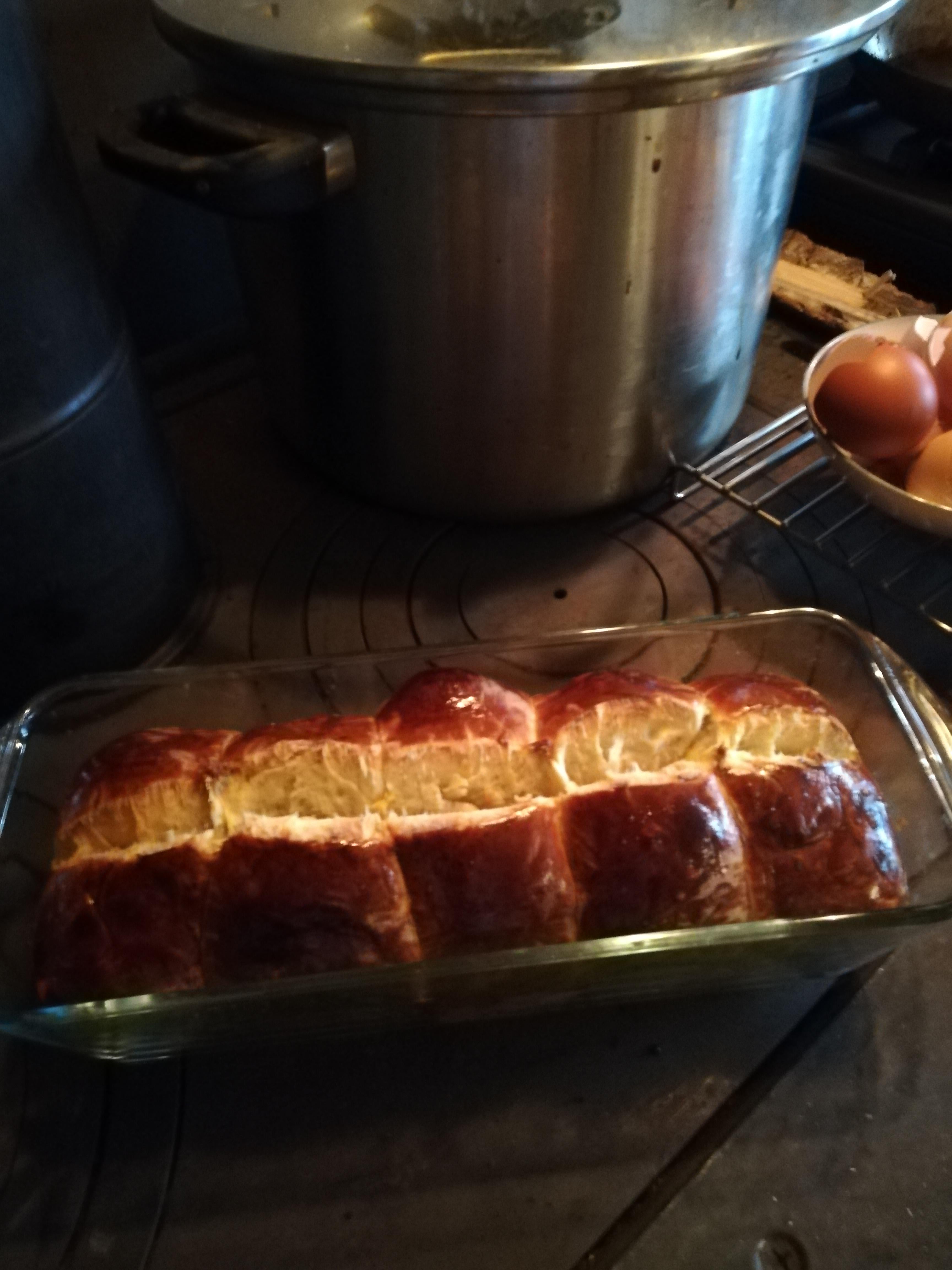 Ma Chérie élève avec amour un levain. Elle ne lui a pas encore donné de petit nom mais s’est lancée pour sa 1ère utilisation. Une brioche cuite dans la cuisinière à bois