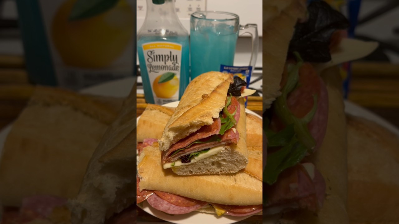 Cheese down and then your vegetables on the top and then start layering your meat all right and this is how your sandwich should look after you put everything on there now let’s make our Southern punch all right now we’re going to make our Southern punch with our blue raspberry lemonade and our simply