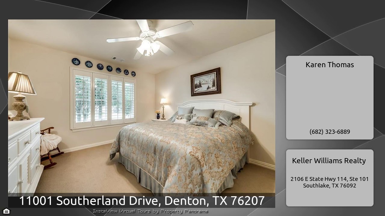 The Virtual Tour for the property at 11001 Southerland Drive, Denton, TX 76207 listed for $239,900: Other homes for sale by Karen Thomas of Keller Williams Realty: Extended Augusta. Open floor plan. Kitchen features granite countertops, roll out shelves, large island & breakfast bar. Light & bright dining area with bay window & view. The living area has french doors and wall space for your large TV. Living & dining area have siloutte shades & custom window cornices. Office-Flex room with desk nook & plantation shutters. Large master with tray ceiling & plantations shutters. Large master …