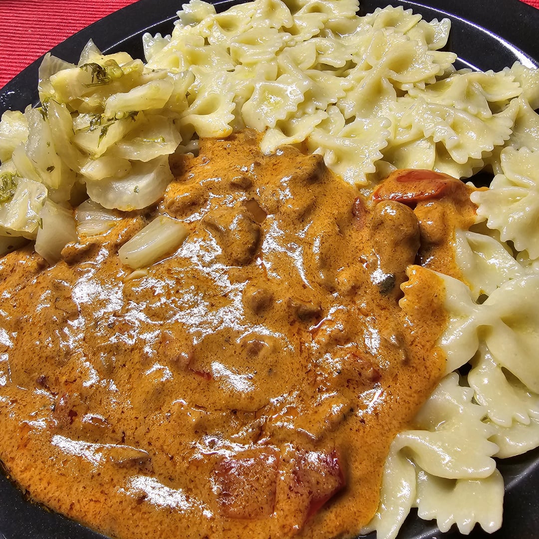 Sliced pork in a creamy sauce, with farfalle pasta and fennel steamed in lemon juice and olive oil by Gulliveig europeEurope EatsWrite A CommentYou must be logged in to post a comment.