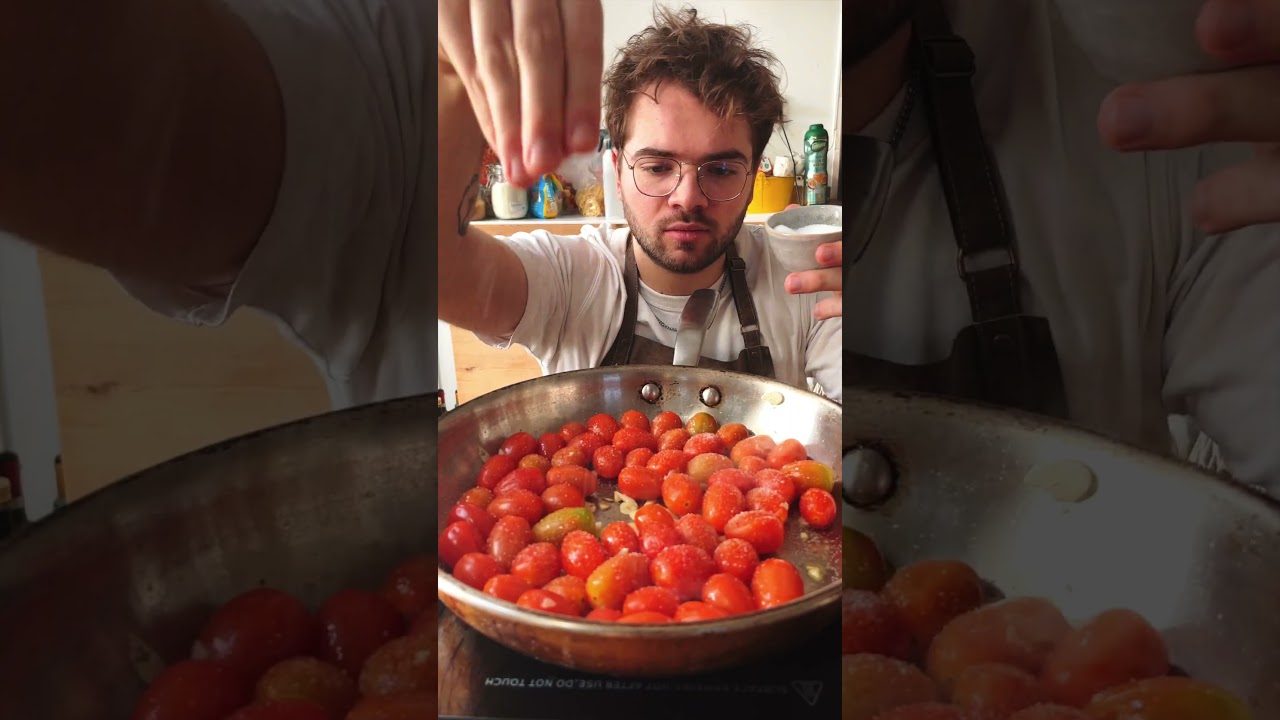 Never get enough also toss in some cherry tomatoes as well as a generous amount of salt this is gonna draw the moisture and make the tomatoes break down and let all of their tomato juices out some of them may need some help to burst but eventually you will be left
