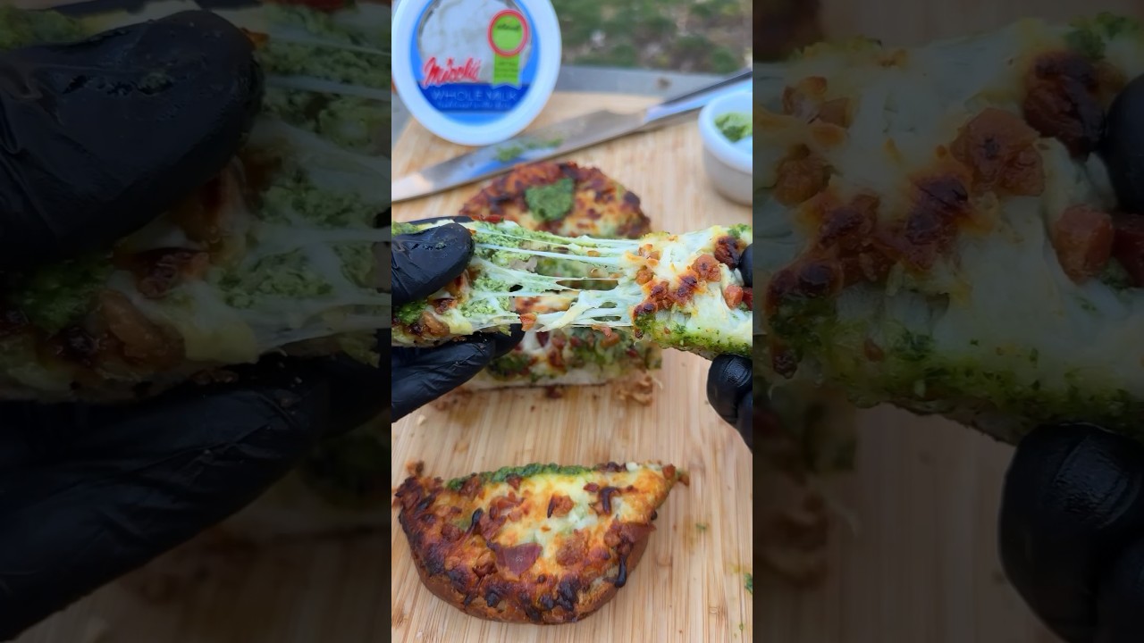 Nice loaf of bread I used aago slice it in half and don’t remove any of that bread come on we’re not animals time to assemble the crew start with some white pizza sauce otta pesto mozzarella cheese and then crispy Panetta if you don’t like these toppings make what want bake