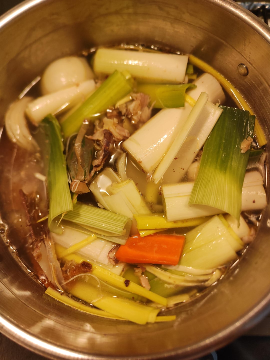 Le tout dans un faitout avec des carottes, poireaux, oignon, ail et bouquet garni maison.
