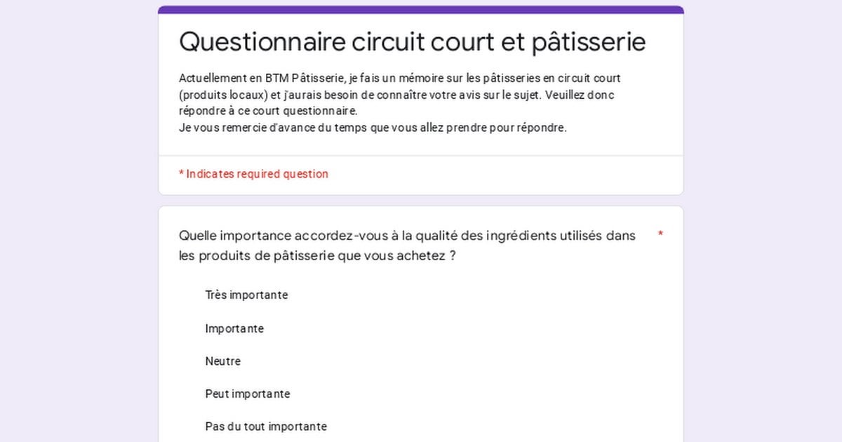 Actuellement en BTM Pâtisserie, je fais un mémoire sur les pâtisseries en circuit court (produits locaux) et j’aurais besoin de connaître votre avis sur le sujet. Veuillez s’il vous plait répondre à ce court questionnaire.