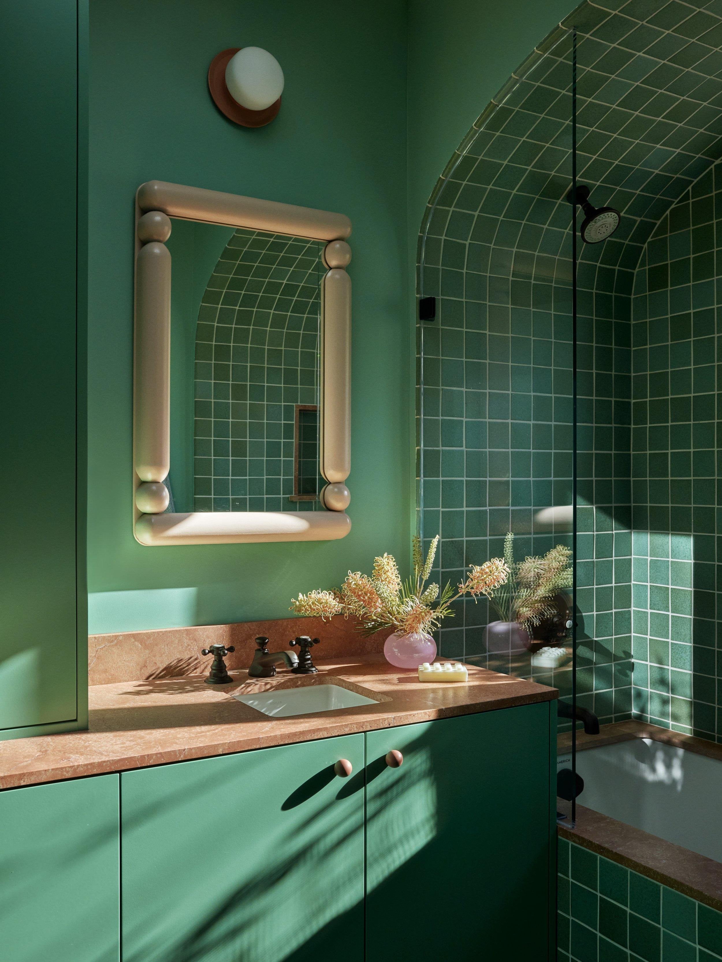 Teal bathroom with a tile-clad arched bathtub nook in a renovated 1920s hilltop house in Mount Washington full of vibrant colors, Los Angeles [2500×3333]