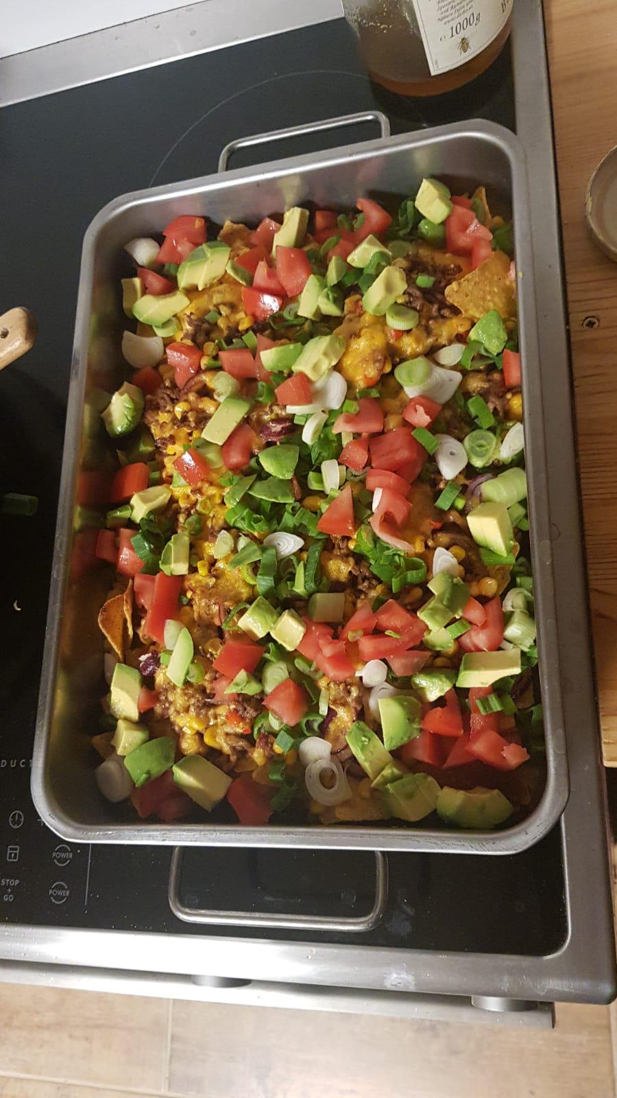 i made nachos! (i know you cant see them, i went wild on the toppings) ive got ground meat, chilis, tomatos, avocado, onion, cheddar, spring onino, corn and kidney beans on there 😀
