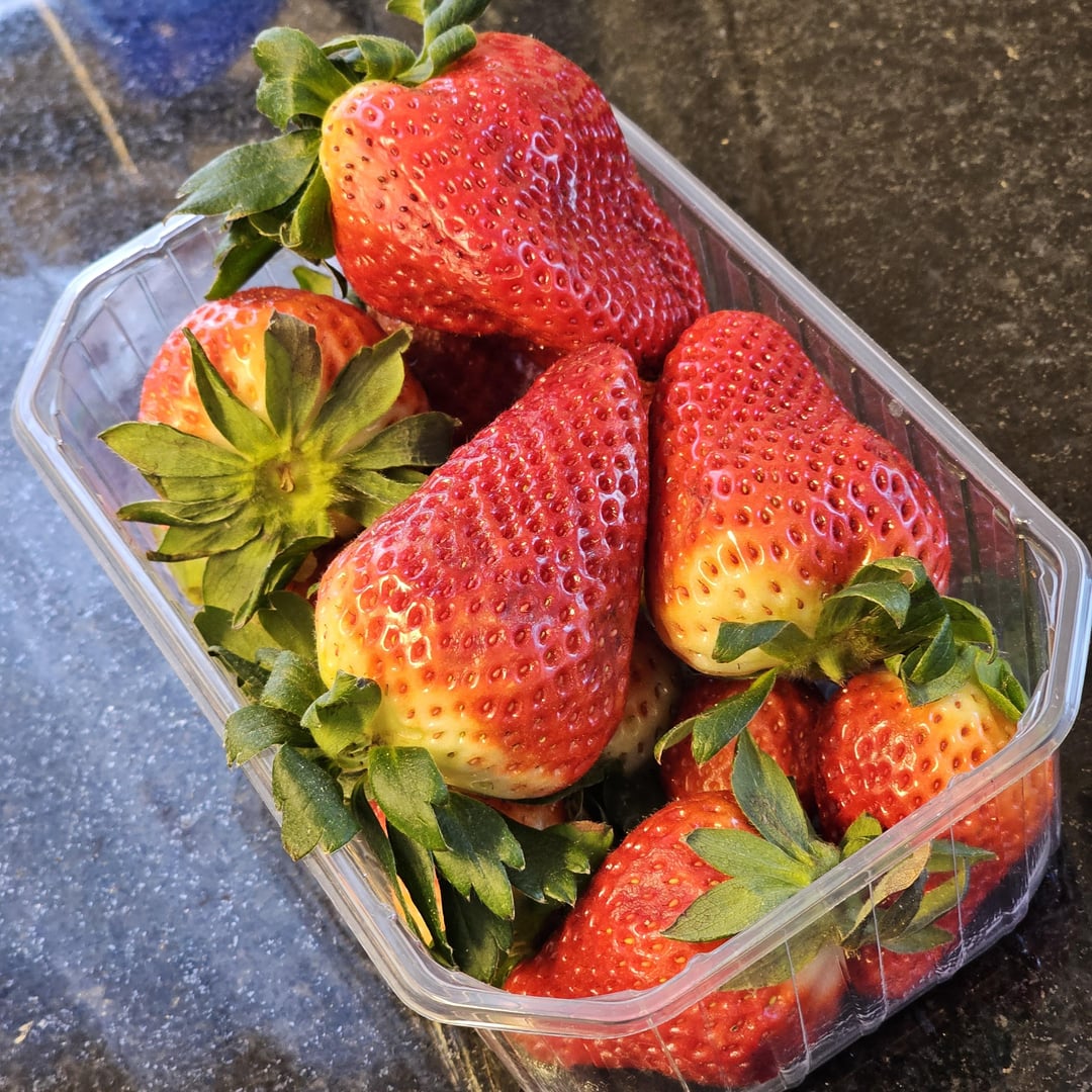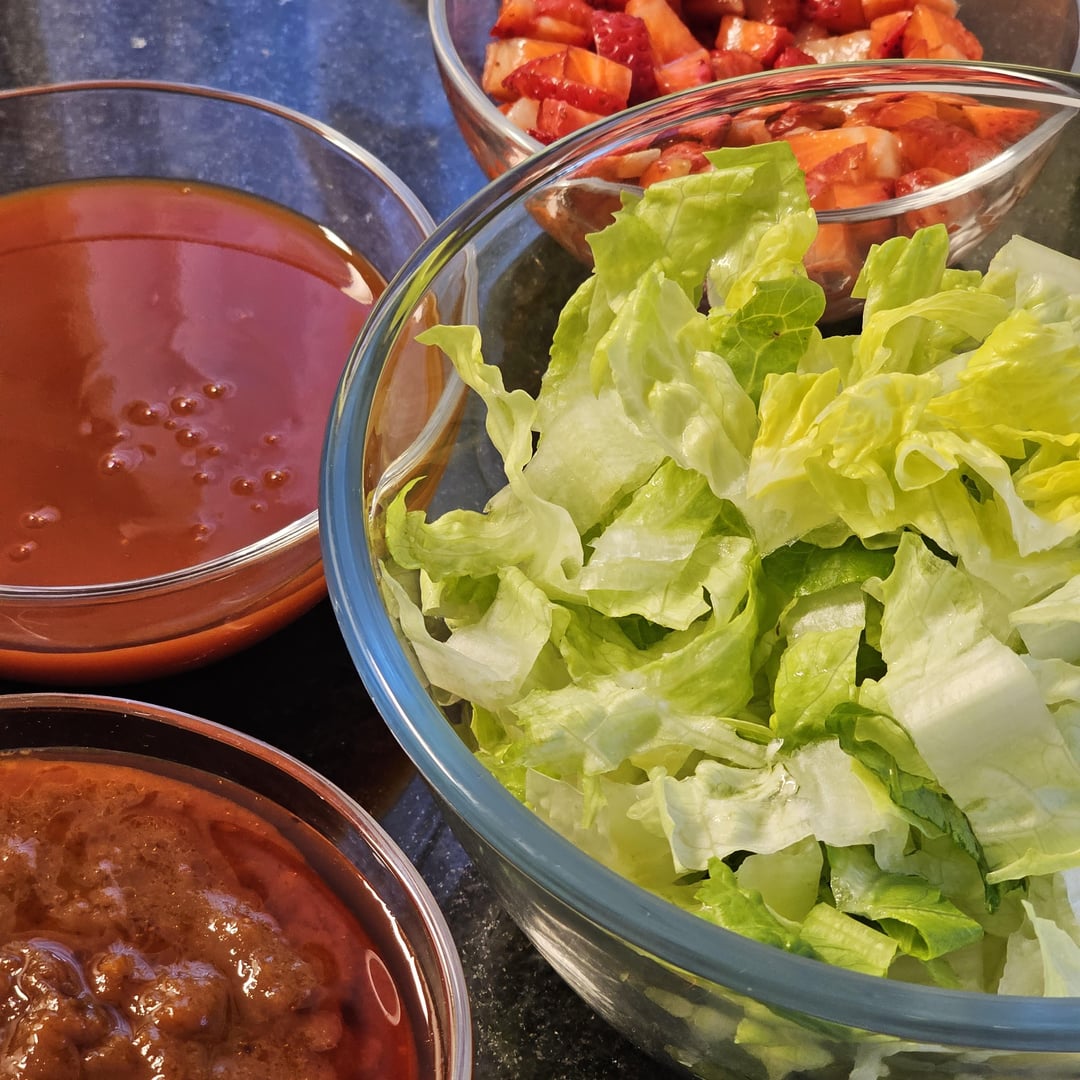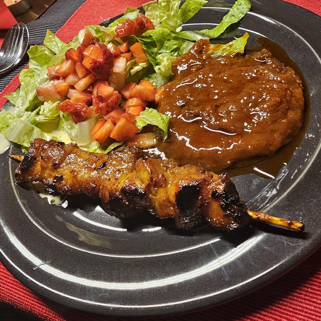 Satay chicken breast with plenty of satay sauce, served with salad and strawberries (instructions in the gallery, read from right to left, needs marinated over night)