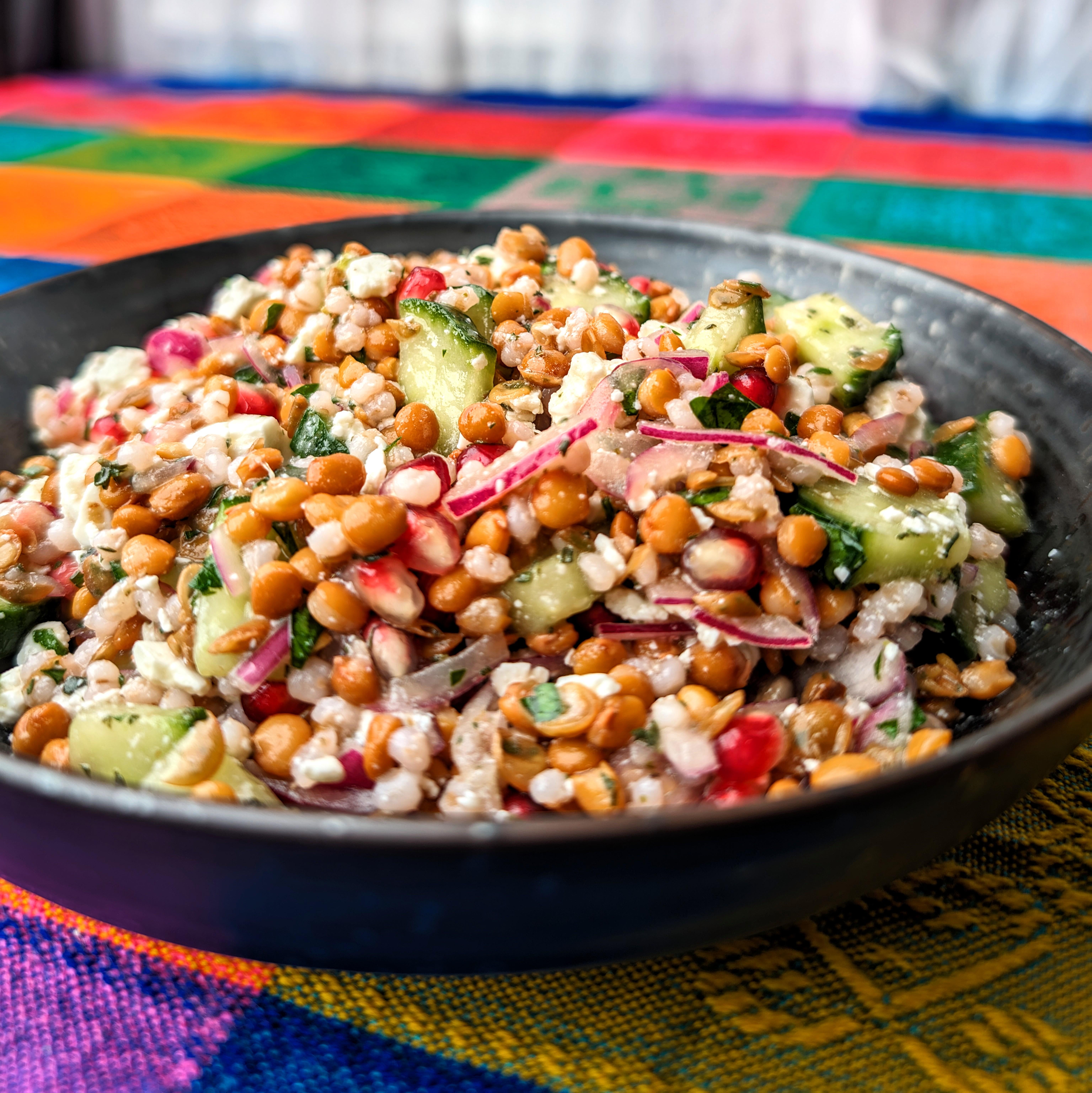 Lentil salad with pearl barley, cucumber, pomegranate seeds, red onion, feta cheese, balsamico bianco, salt, flat parsley and thyme.by UnChorritoDeLimon europeEurope EatsWrite A CommentYou must be logged in to post a comment.