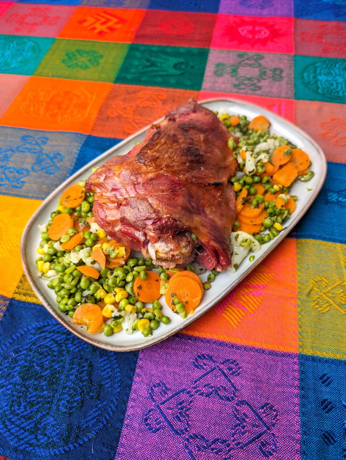 Cured (with curing salt) ans sous vide cooked turkey thigh with sautéed vegetables.
