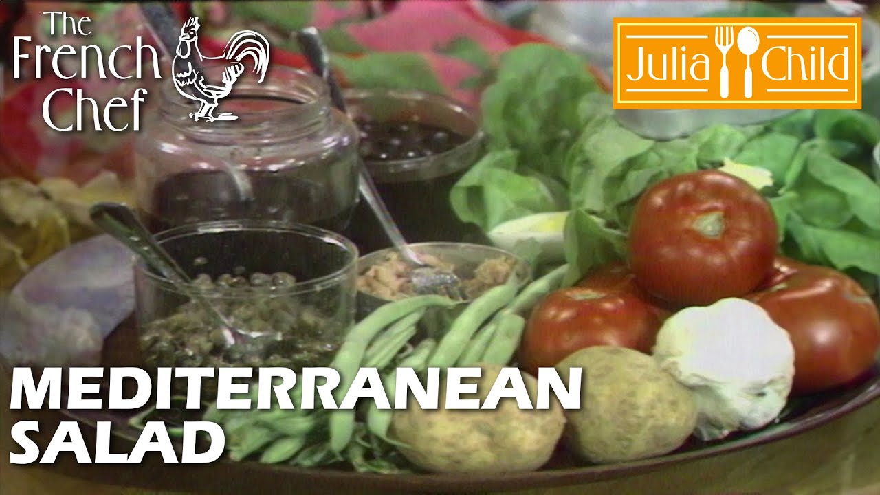 Julia Child makes the Mediterranean salad that’s a meal in itself. Lettuce, tomatoes, potatoes, beans, eggs, tuna fish, capers, anchovies — all spiced with the authentic flavor of the Riviera, and filmed in Nice.