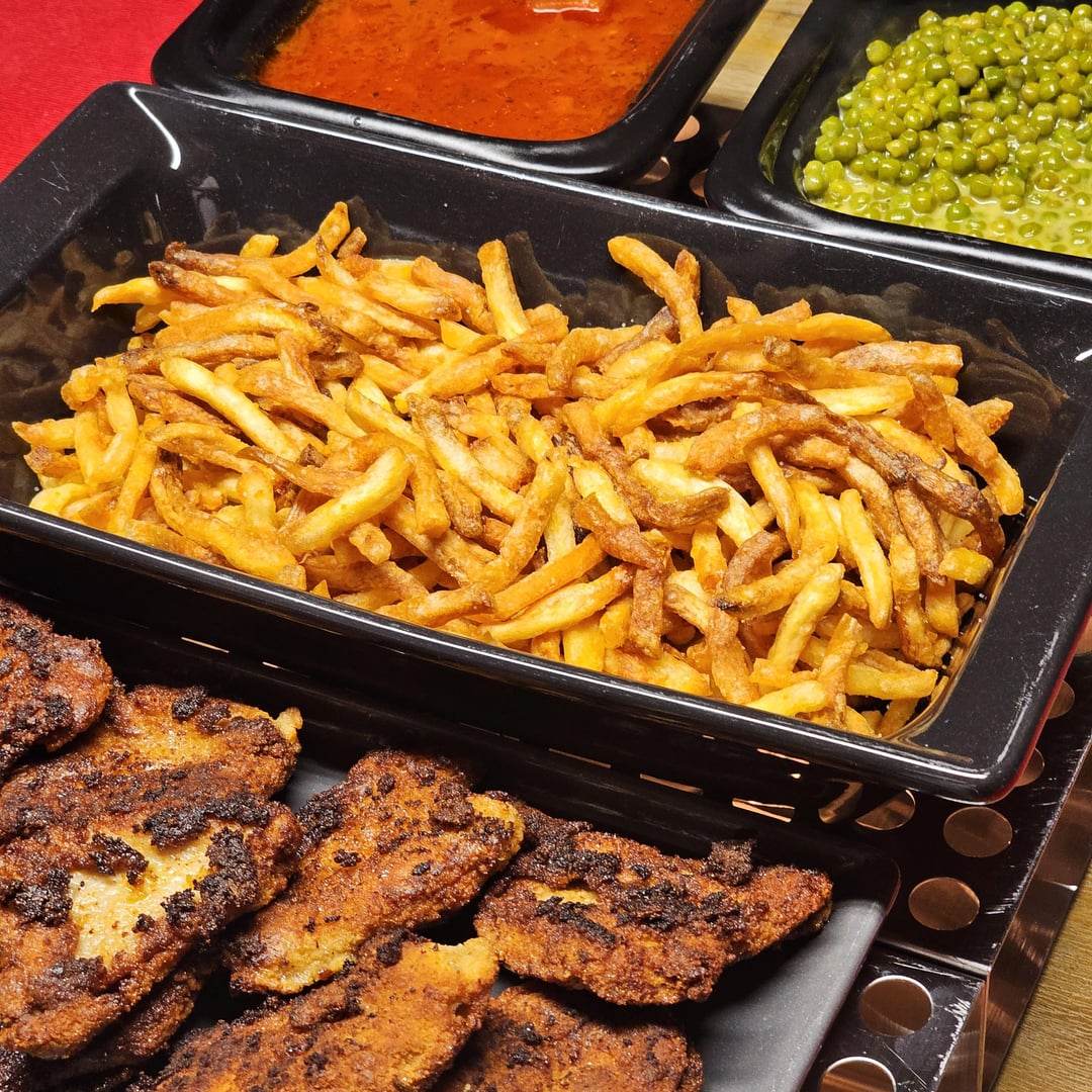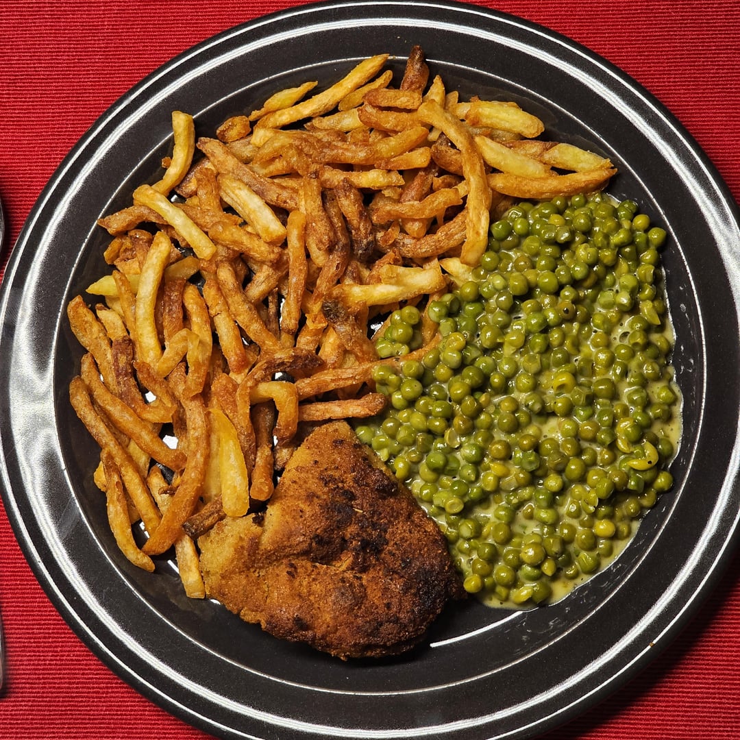 Homemade breaded schnitzel and fries, with creamy caramelised peas (and some of us can’t do without tomato sauce for their fries 😉