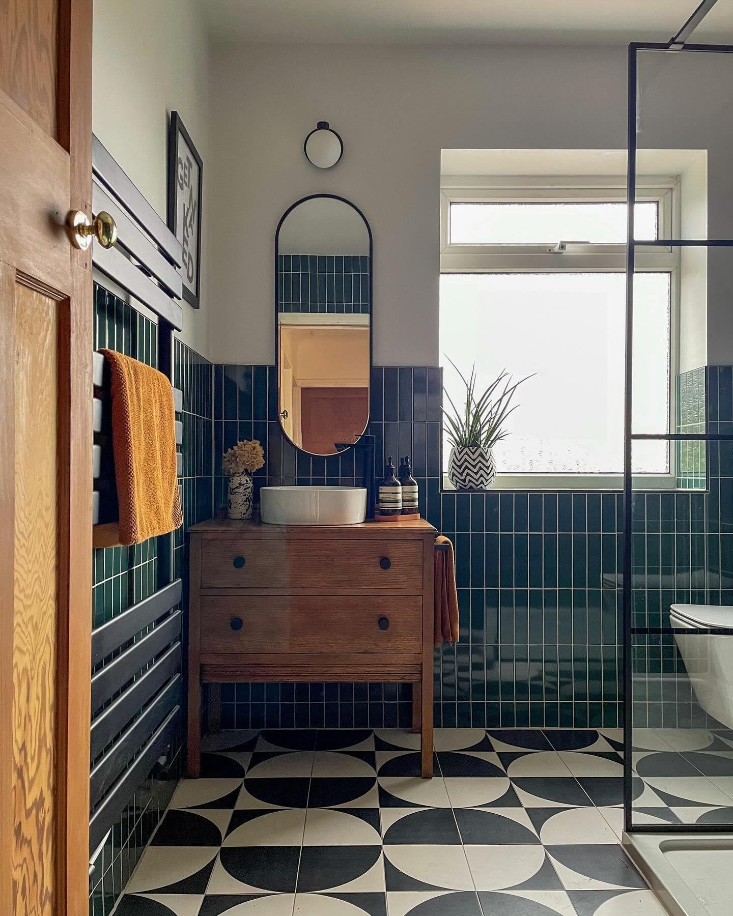 Half-tiled renovation of a 1970s bathroom, Chester, Cheshire, England [1440×1800]by ManiaforBeatles Room Porn 7 Comments ManiaforBeatles 2 years ago [Instagram source](https://www.instagram.com/p/C4U5MUrqEZL/). Photo by carlaelliman. There are two more pics from the link. [More pics and information](https://www.apartmenttherapy.com/green-striped-bathroom-makeover-1200-dollars-ba-37385823). [The bathroom was covered with carpet before the renovation](https://i.imgur.com/RfTk8Kg.jpg). Due-Structure1728 2 years ago Obsessed!! hpwriterkyle 2 years ago Fuck I love that tile sherwooddan 2 years ago Does any know where these floor tiles are from? Been searching with no luck! minusthebra 2 years ago brilliant to my eyes  andrew_cherniy96 2 years ago Damn this looks fire. Would love to design something similar. Bludiamond56 2 years ago Great compositionWrite A CommentYou must be logged in to post a comment.
