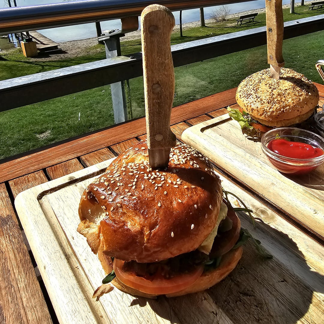 Beef Burger (minced beef, cheese, tomatoes, gherkins, melted onions, rocket) with a side salad; and a Vegan Burger (with a cauliflower patty, lettuce, tomato, cucumber, sprouts and chive cream) with fries; served at the lake near Radolfzell, Germany