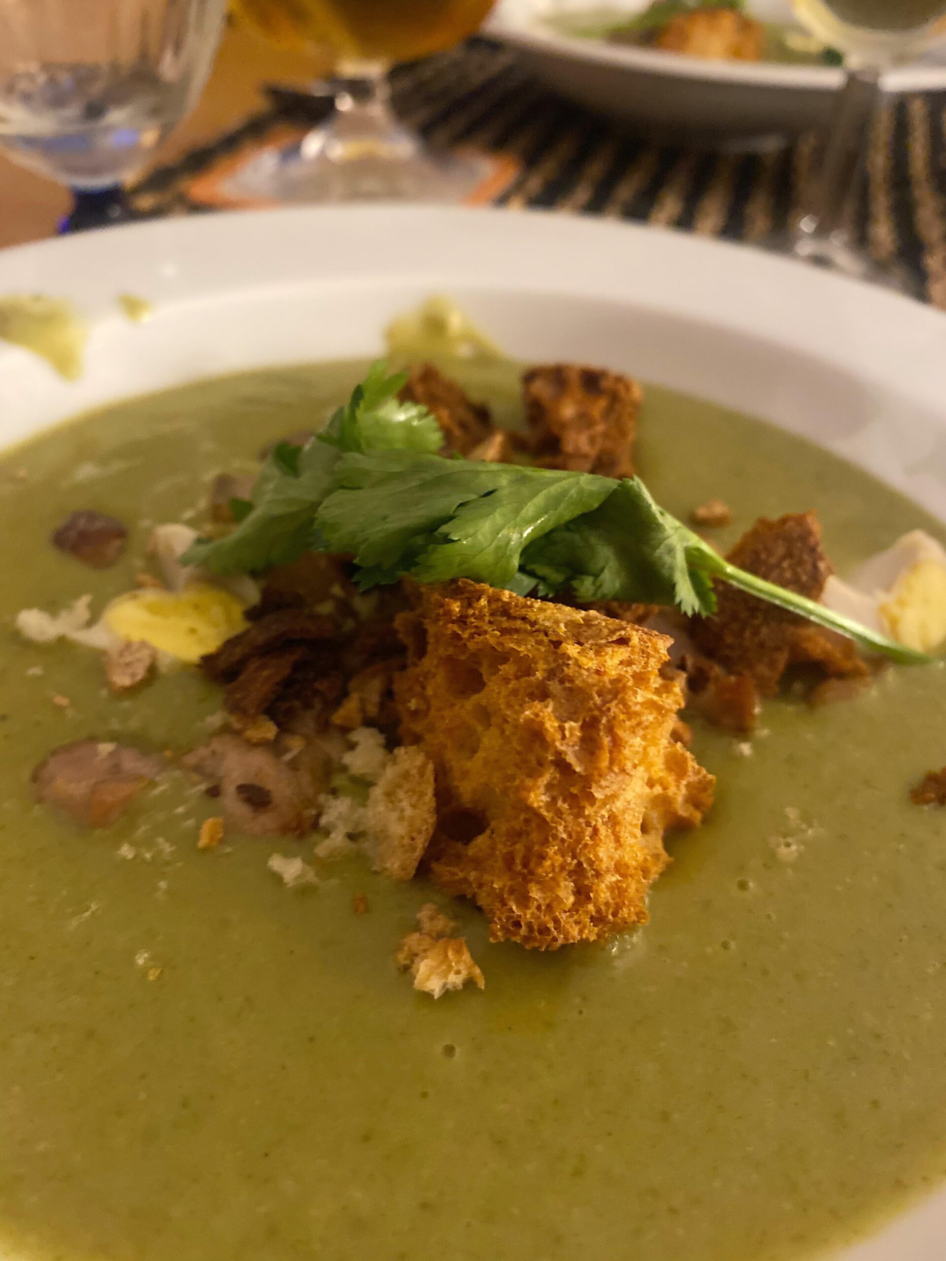 Inspiré d’une recette de Philippe Etchebest, avec principalement de la mâche, de l’oignon bien sué pour bien relever le goût du velouté, des pommes de terres, un bouillon de volaille, crème, œufs de cailles et les restes de ma baguette de trois jours et des dernières feuilles de coriandre ✨