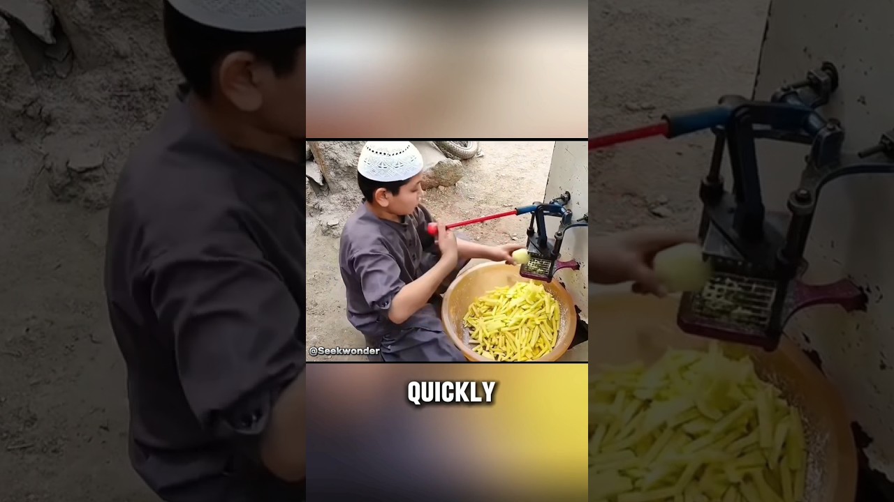 Why Indian prefer Street cheap KFC fries than the expensive one you’ll understand after watching this 12-year-old boy make french fries first he pours potatoes into a basin he uses a machine he invented to cut the potatoes into strips quickly and safely then he adds some starch and