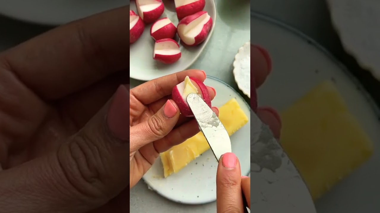 Here’s my hack for softening butter fill boiling water in an empty jar toss that water then flip the jar over a stick of butter for about five minutes while the butter is softening make a wedge cut in the middle of a radish add that butter right in that wedge then sprinkle it