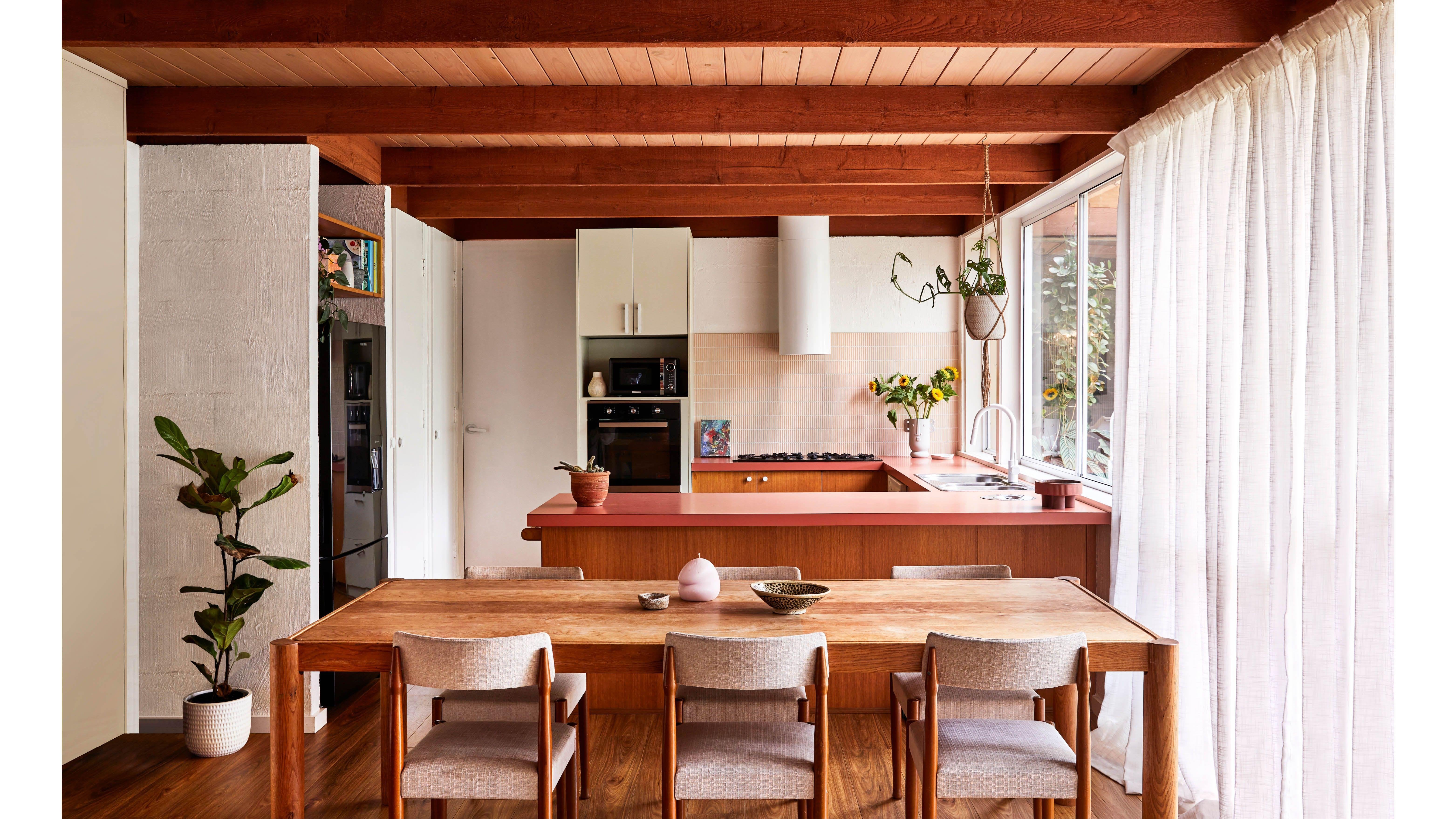 Kitchen with Kit Kat tile backsplash and original pink benchtops in a renovated 1980s house, Mount Martha, Melbourne, Victoria, Australia [6250×3515] by ManiaforBeatles Room Porn 2 Comments ManiaforBeatles 2 years ago [More pics and information](https://thedesignfiles.net/2024/03/homes-miles-rachael-white-mount-martha). [Love the lush, almost overgrown garden](https://i.imgur.com/ASp8UpH.jpg). tdog666 2 years ago Unbelievably gorgeous, the dark ceiling works so well!Write A CommentYou must be logged in to post a comment.