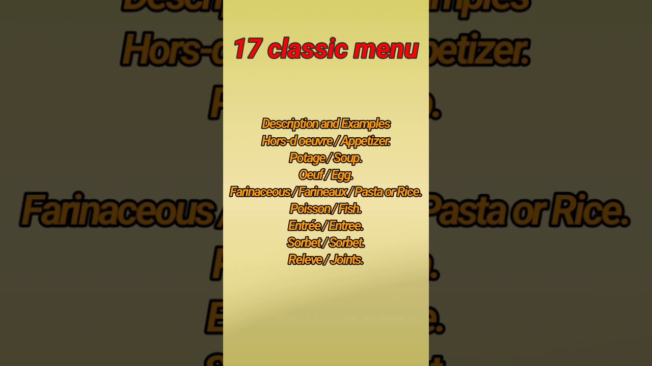 17 course French classical menu with description and examples or ER appetizer potage soup Earth egg farinaceous fenu pasta or rice Pon fish entree entree s s relev joints