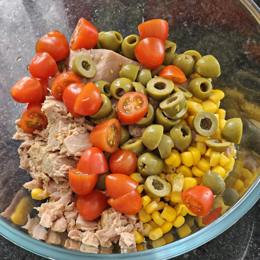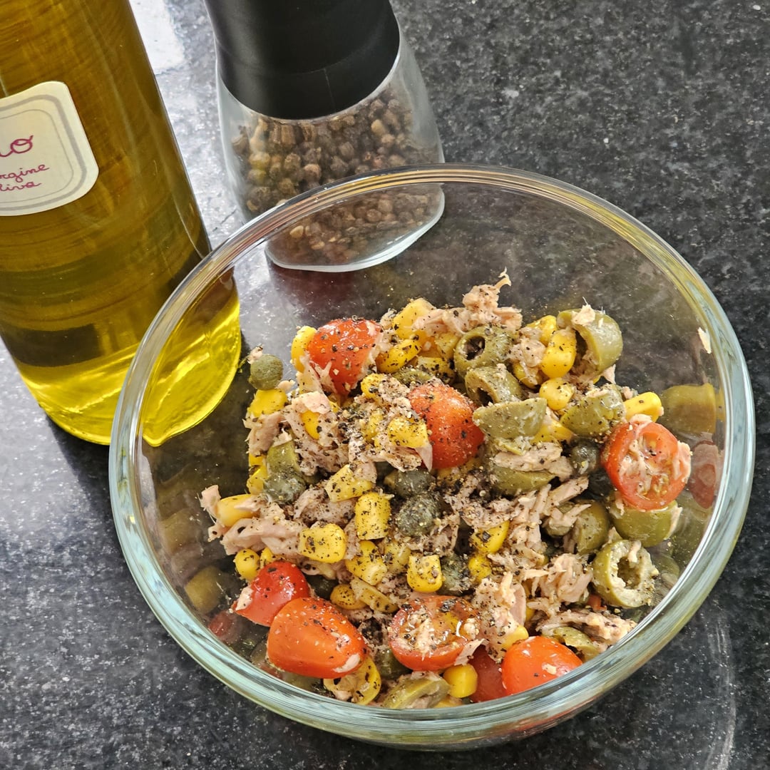 A very hastily composed salad consisting of olives, cherry tomatoes, corn, capers, tuna, an excellent olive oil (still more than ok in spite of the overall sinking quality) and freshly ground black pepper (prep time 5 mins). I love it :)
