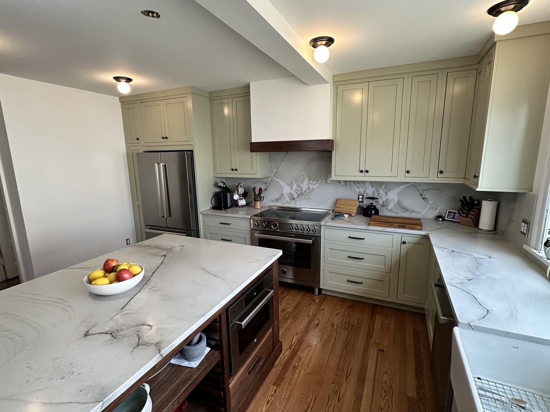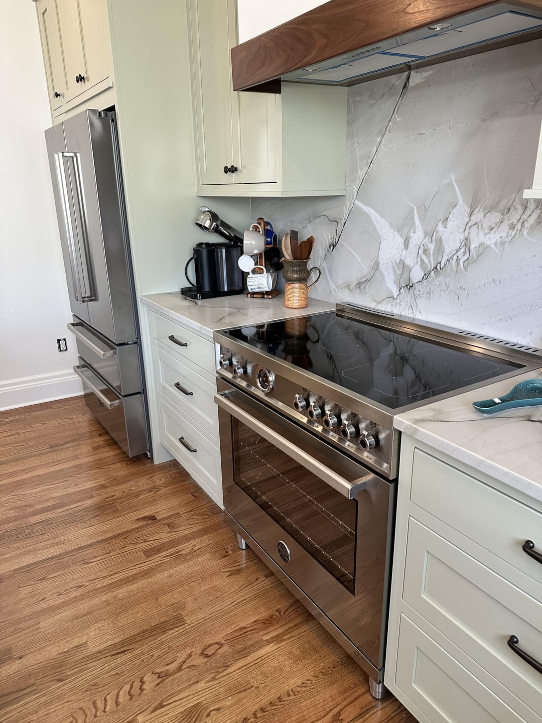 Love your colors! Especially the green cabinets, what is the exact shade? What brand/pattern quartz?