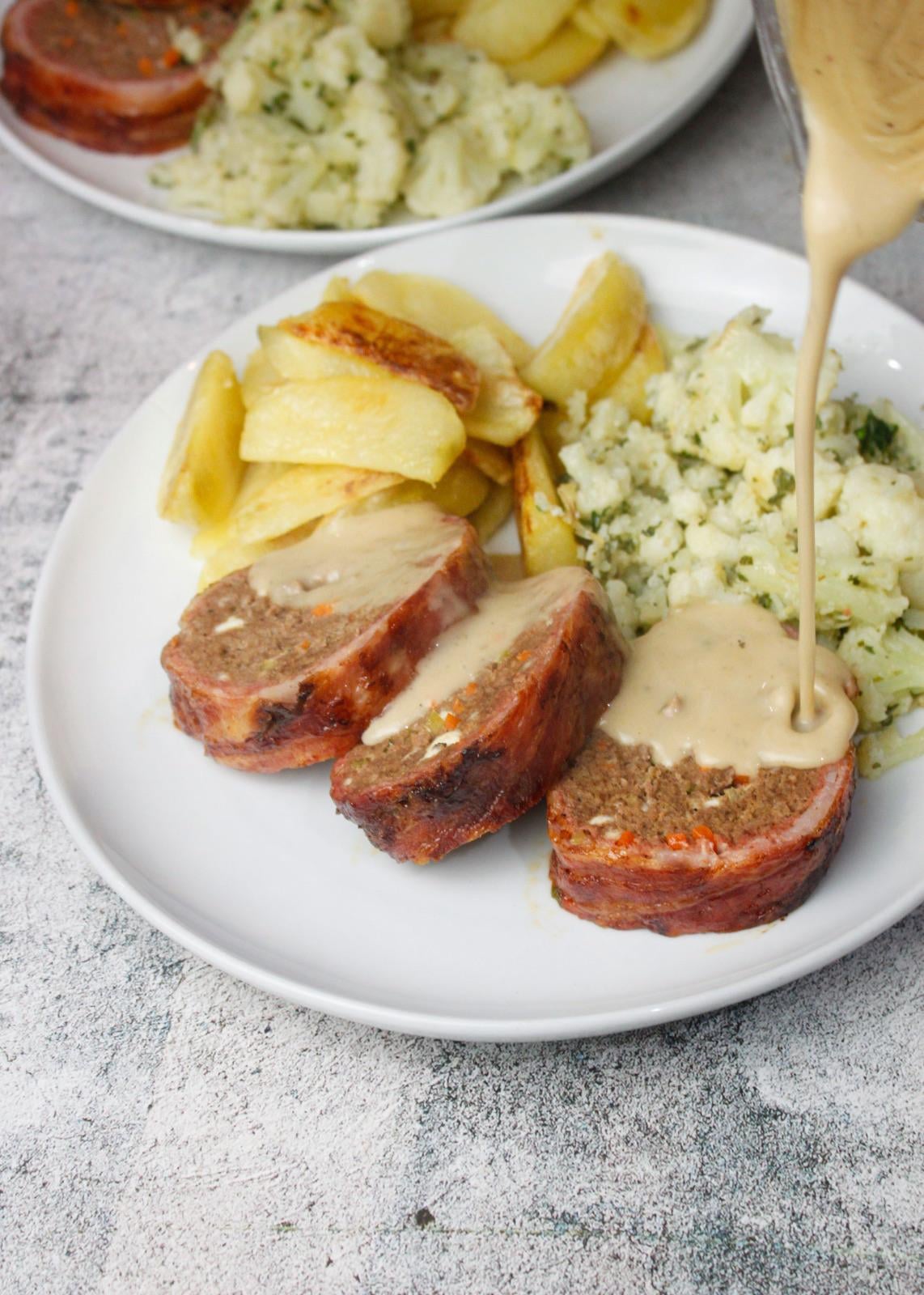 Meatloaf with feta cheese & vegetables wrapped in bacon, served with roast potatoes, cauliflower tossed in herbs and a pepper sauce