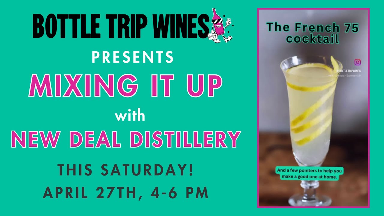 On April 27th from 4-6pm, we hope you’ll join us at the distillery for a special event celebrating Bottle Trip Wine’s third anniversary. New Deal Crew Member & Bottle Trip Wines Founder, Bonny MacDonald, has put together a special event showcasing Bottle Trip Wine Club offerings and sharing expert guidance on how to use wine in cocktails. Bonny has designed a special menu of wine-focused cocktails featuring New Deal craft spirits to enjoy along with light snacks and wine & vermouth tastings.