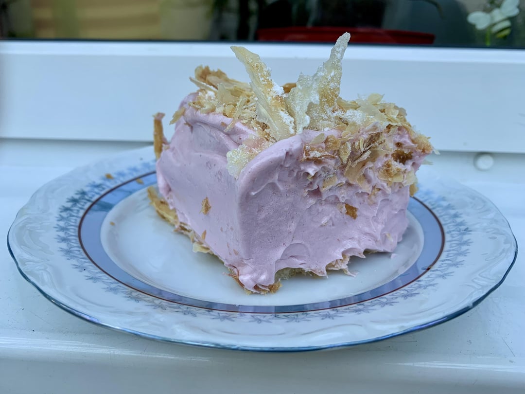 Spumos is a regional pastry from the Cluj area in Transylvania filled with raspberry or strawberry “foam” which is not the same as mousse. The taste is sweet and tart, which makes it a perfect spring/summer dessert. It can usually be bought in cake shops (cofetării) in Cluj county and the surrounding area but this one is home made by my mom.
