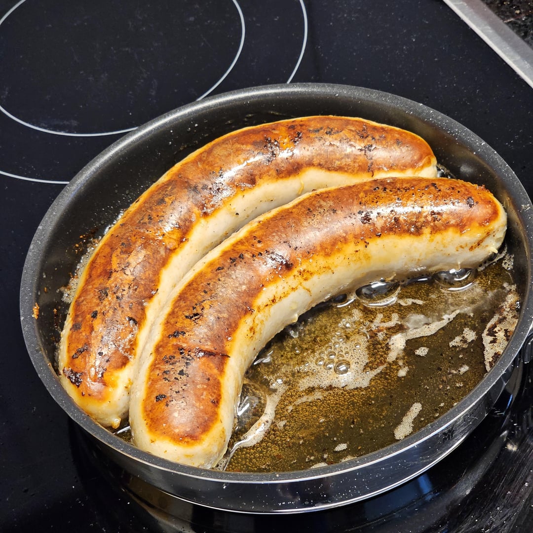 Swiss bratwurst with airfried homemade fries [NSFSG, because the St. Gallen purists will claim that the sausage is so perfect that it certainly doesn’t need mustard]