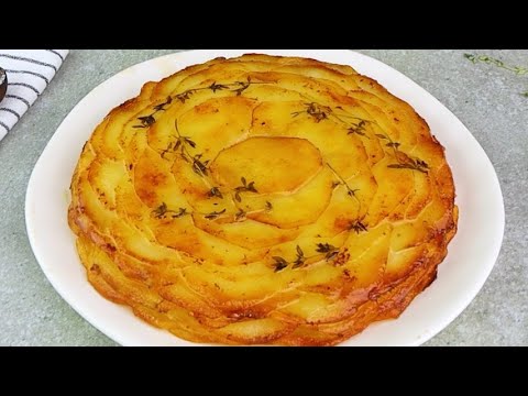 3. Garnish with a few sprigs of thyme in the bottom of the pan, then layer the potato slices overlapping in a concentric circle. Start with one round slice in the center. Then an inner circle, then the outer circle. Season with salt and pepper and add parmesan cheese.