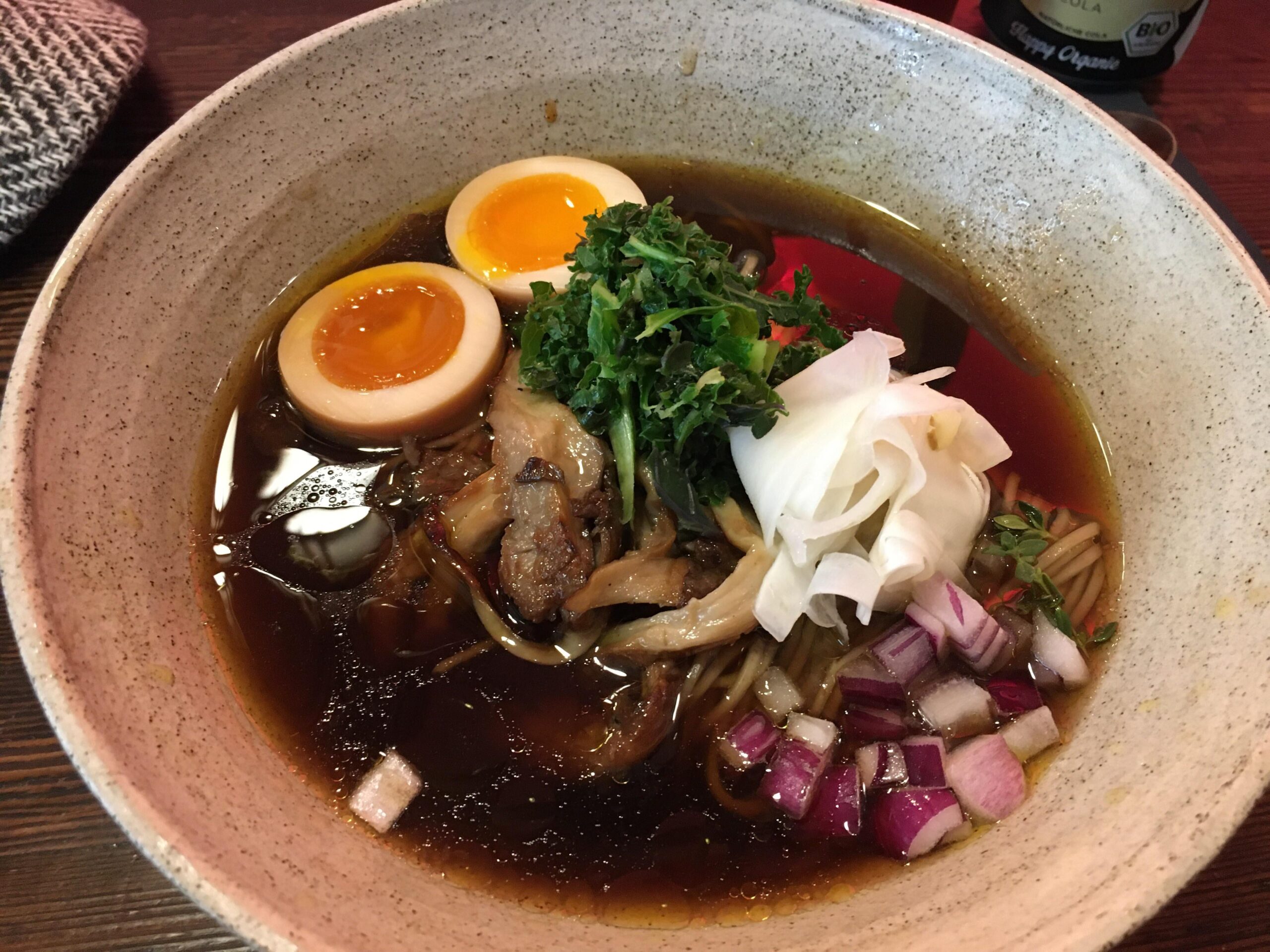 I was traveling through and had the chance to go to Slurp ramen joint in Copenhagen, which is a small ramen restaurant, where you can not book a table but have to wait. Usual waiting times are (according to the locals which had been in the line in front of us) 45 Minutes, we were lucky and came after the first lunch rush and waited around 15 Minutes. I chose the veggie ramen with egg (making the ramen vegetarian), which tased very mushroom-y and were also very delicious.