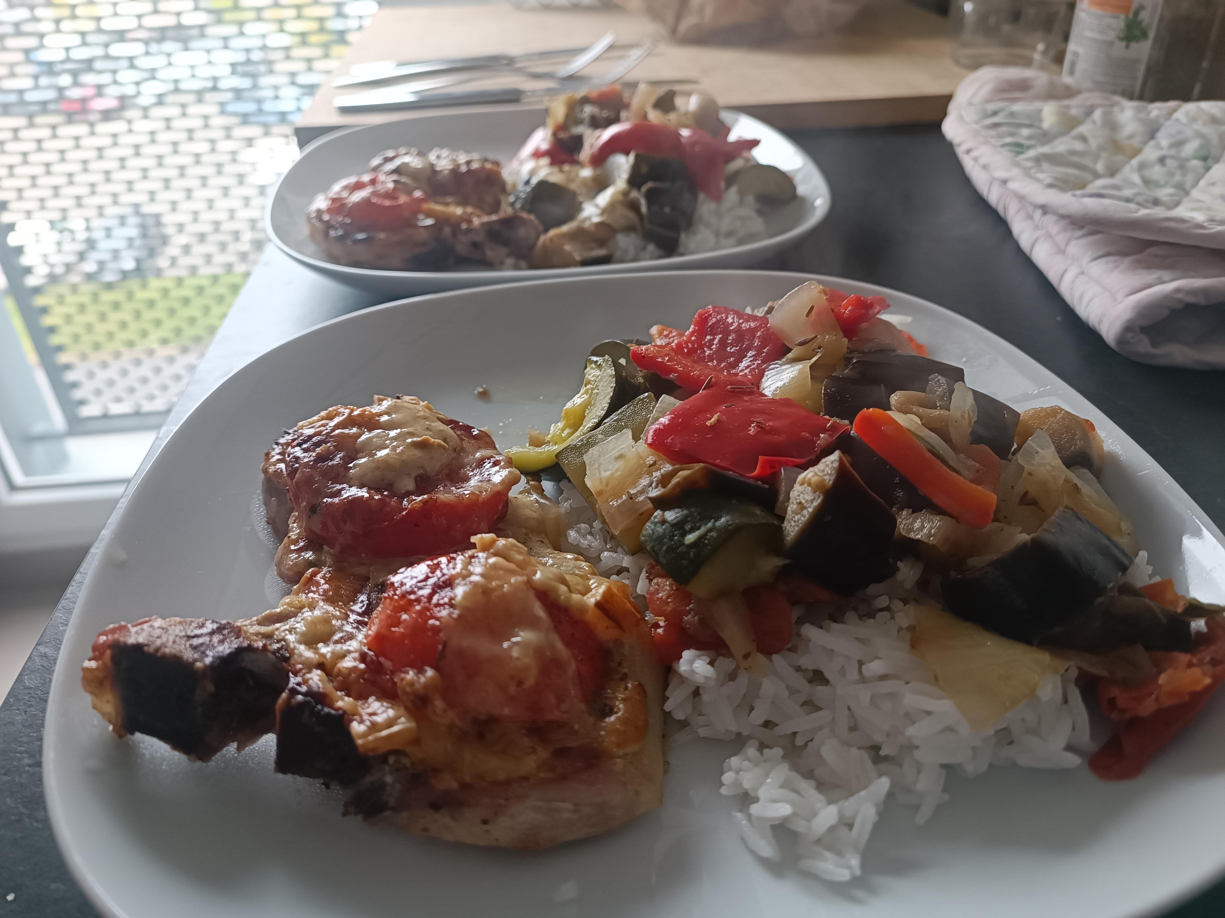 Ratatouille et côte de porc “à la sicilienne”, bien sûr accompagné de riz parce que le riz, c’est la vie !