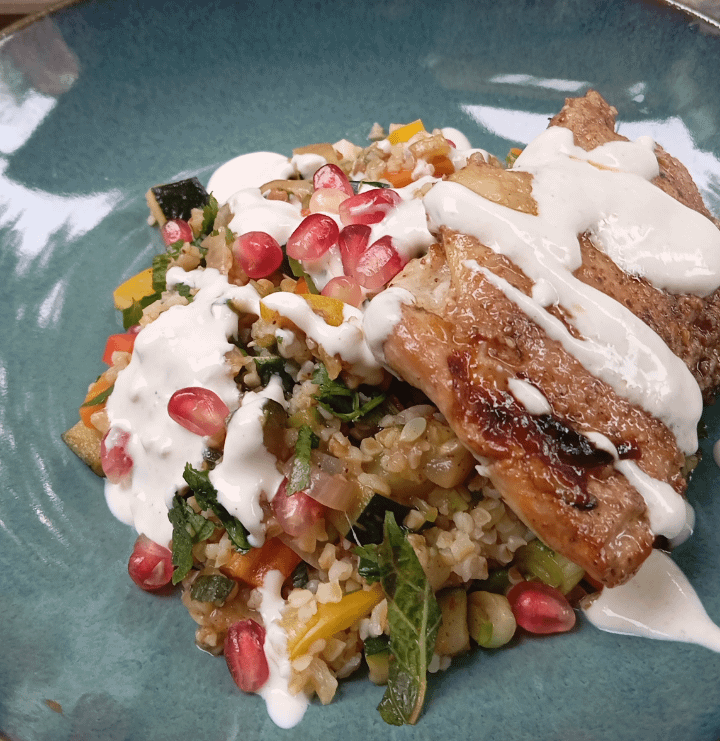 Bulgur with grilled and fresh veggies, chicken thigh, yoghurt-tahine sauce